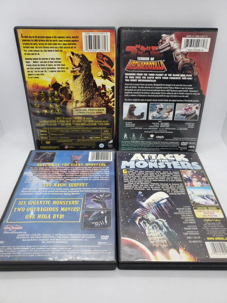 Godzilla & Friends DVD Lot: Godzilla Final Wars (2004), Terror Of Mechagodzilla (1975), Attack Of The Monsters (1969), Return Of The Giant Monsters (1967 aka Gamera vs, Gyaos), The Magic Serpent (1966). Good Condition; cases have some wear [see photos], Discs will be cleaned and buffed before shipping, if needed. Shipped with USPS Media Mail.