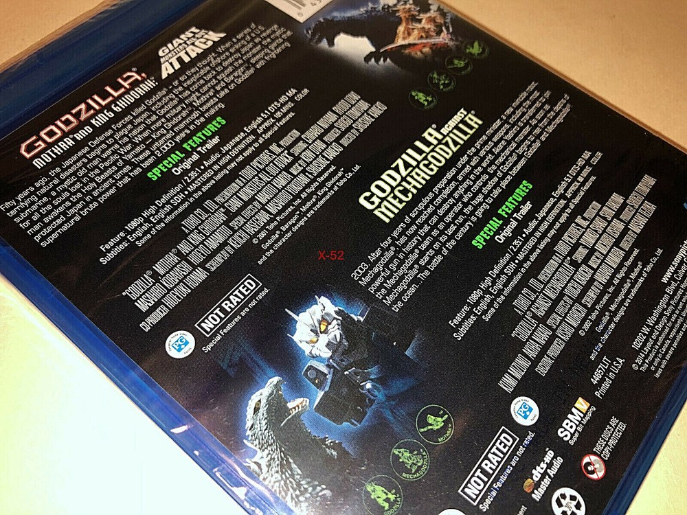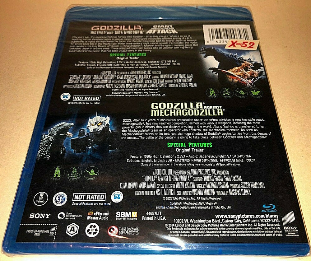 Offering the OFFICIAL release BLU-RAY double feature: GODZILLA & MOTHRA & KING GHIDORAH GIANT MONSTERS ALL OUT ATTACK (aka G.M.K) and GODZILLA AGAINST MECHAGODZILLA Questions welcome / More MOVIEs CDs TOYs in OUR ebay store https://www.ebay.com/str/X-52-STORE?_trksid=p2047675.l2563 Reduce shipping with another purchase in our store