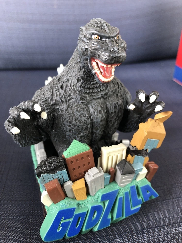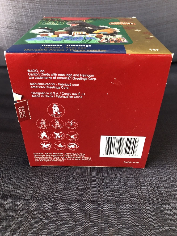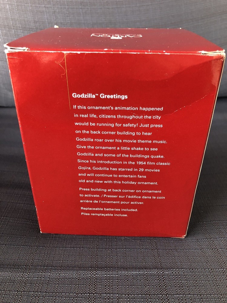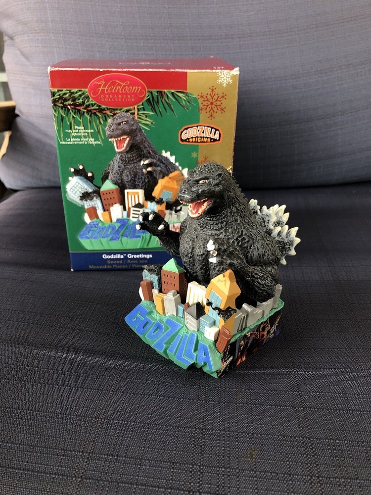 Godzilla Greetings Carlton Heirloom Christmas Ornament Sound 2006 #147 *VIDEO*. Preowned Godzilla Greetings ornament. Box shows some wear, see photos. See video in photos to see and hear ornament! Plays the Godzilla then when you touch button in back corner. Godzilla and the building are both in springs do they “shake”. Very cute! Smoke free home.