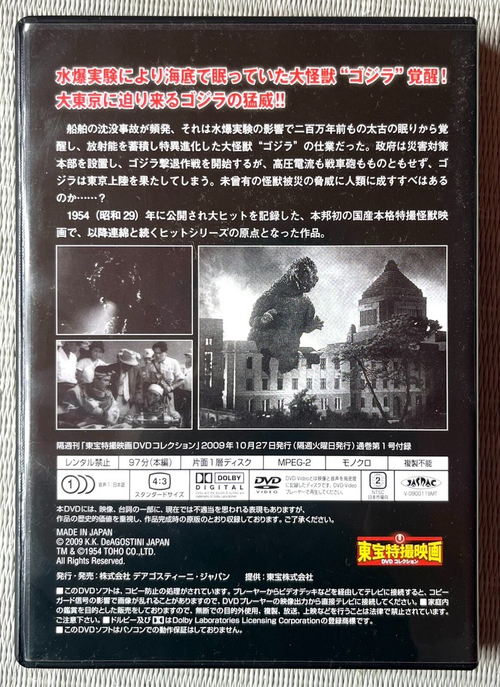 Toho special effects movie DVD collection A hydrogen bomb test awakens the giant monster Godzilla, who had been sleeping on the ocean floor. Godzilla's ferocious threat approaches Tokyo! Frequent hydrogen bombings of ships have been blamed on Godzilla, a giant monster that has awakened from a 2 million year old slumber as a result of hydrogen bomb tests, accumulating radiation and undergoing a unique evolution. The government sets up a disaster response headquarters and begins a strategy to repel Godzilla, but Godzilla lands on Tokyo, ignoring high voltage electricity and tank guns. Is there anything humanity can do against the unprecedented monster disaster? Released in 1954 (Showa 29), this is Japan's first fully-fledged special effects monster movie and a huge hit, marking the beginning of the hit series that has continued ever since.