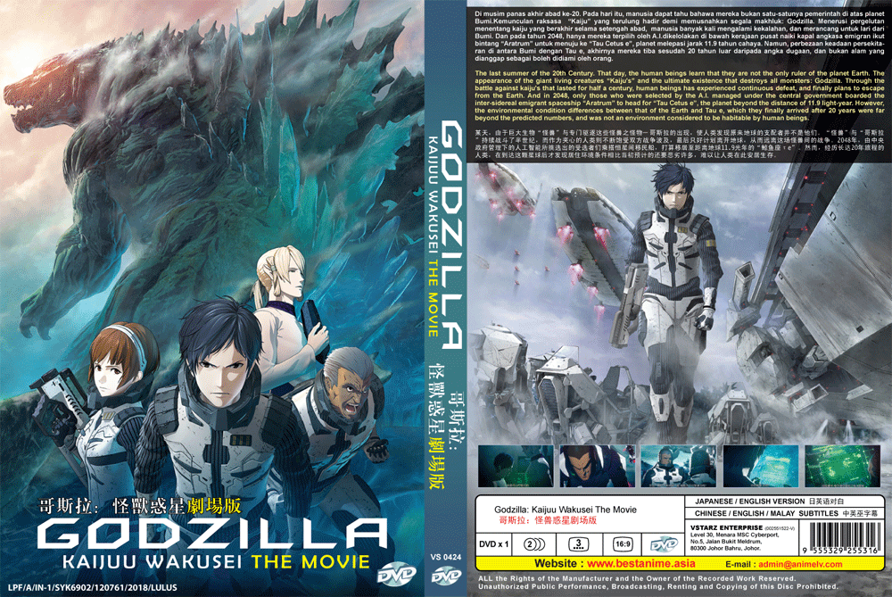 Anime DVD: Godzilla: Kaijuu Wakusei The Movie (2018) sku no: *SKCT-210923527* weight: 160g Product Description: Language: Japanese/English Subtitle: English/Chinese/Malay Media Type: NTSC; Widescreen 16:9, All Region Production: 2018 No. of Disc: 1 DVD Synopsis: The last summer of the 20th Century. That day, the human beings learn that they are not the only ruler of the planet Earth. The appearance of the giant living creatures “Kaiju's” and the ultimate existence that destroys all monsters: Godzilla. Through the battle against kaiju's that lasted for half a century, human beings has experienced continuous defeat, and finally plans to escape from the Earth. And in 2048, only those who were selected by the A.I. managed under the central government boarded the inter-sidereal emigrant spaceship “Aratrum” to head for “Tau Cetus e”, the planet beyond the distance of 11.9 light-year. However, the environmental condition differences between that of the Earth and Tau e, which they finally arrived after 20 years were far beyond the predicted numbers, and was not an environment considered to be habitable by human beings. The young man on the emigrant ship: Haruo, who saw his parents killed by Godzilla in front of his eyes when he was 4 years old, had only one thing in his mind for 20 years: to return to the Earth and defeat Godzilla. Shut out from the possibility of emigration, as the living environment in the ship deteriorates, the group of “Earth Returnists” led by Haruo became the majority, and determines to head back to Earth through a dangerous long-distance hyperspace navigation. However, the Earth they have returned has already passed the time of 20,000 years, and has become an unknown world with the ecosystem reigned by Godzilla.