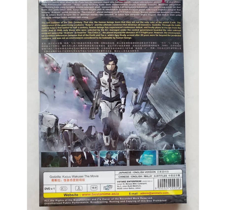 Anime DVD: Godzilla: Kaijuu Wakusei The Movie (2018) weight: 160g Product Description: Language: Japanese/English Subtitle: English/Chinese/Malay Media Type: NTSC; Widescreen 16:9, All Region Production: 2018 No. of Disc: 1 DVD Synopsis: The last summer of the 20th Century. That day, the human beings learn that they are not the only ruler of the planet Earth. The appearance of the giant living creatures “Kaiju's” and the ultimate existence that destroys all monsters: Godzilla. Through the battle against kaiju's that lasted for half a century, human beings has experienced continuous defeat, and finally plans to escape from the Earth. And in 2048, only those who were selected by the A.I. managed under the central government boarded the inter-sidereal emigrant spaceship “Aratrum” to head for “Tau Cetus e”, the planet beyond the distance of 11.9 light-year. However, the environmental condition differences between that of the Earth and Tau e, which they finally arrived after 20 years were far beyond the predicted numbers, and was not an environment considered to be habitable by human beings. The young man on the emigrant ship: Haruo, who saw his parents killed by Godzilla in front of his eyes when he was 4 years old, had only one thing in his mind for 20 years: to return to the Earth and defeat Godzilla. Shut out from the possibility of emigration, as the living environment in the ship deteriorates, the group of “Earth Returnists” led by Haruo became the majority, and determines to head back to Earth through a dangerous long-distance hyperspace navigation. However, the Earth they have returned has already passed the time of 20,000 years, and has become an unknown world with the ecosystem reigned by Godzilla. ⭐ 100% Original Brand New Item ⭐ We Only Sell Original/Genuine DVDs. All DVDs I'm selling are from Licensed Publisher in Malaysia. ⭐ Bubble Padded Packaging Payment & Shipping: Item will be processed and ship within 3 working day (not included weekend or public holiday). Tracking number will be provided. As the seller, we are not liable for any extra cost/ charge/ tax imposed by your custom upon receiving the package. Item should reach to your doorstep within 14-30 working days, subject to locations and custom clearance. About Left or Leaving Feedback: Please contact me to resolve any bad issue before leaving neutral or negative feedback. I usually leave feedback for buyers after 3 weeks or the parcel confirmed delivered. Thank you for your business! Have a nice day.... : )