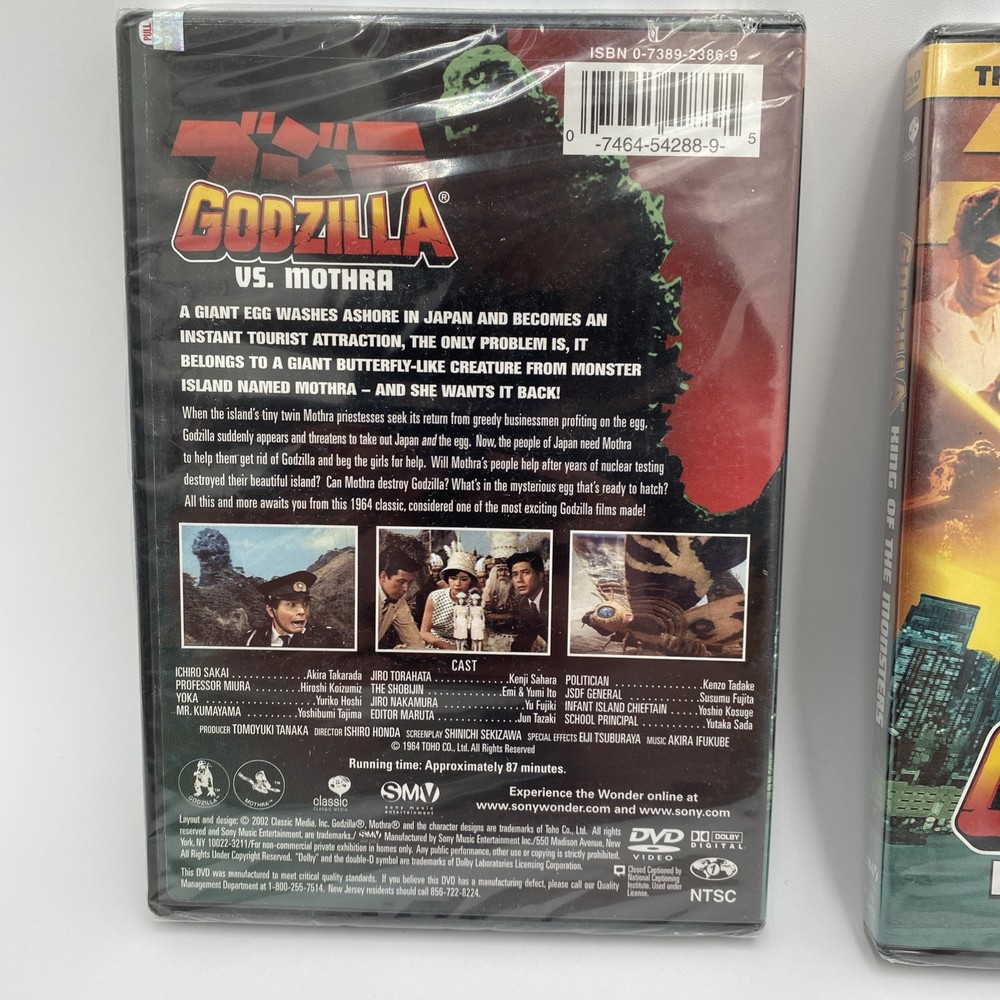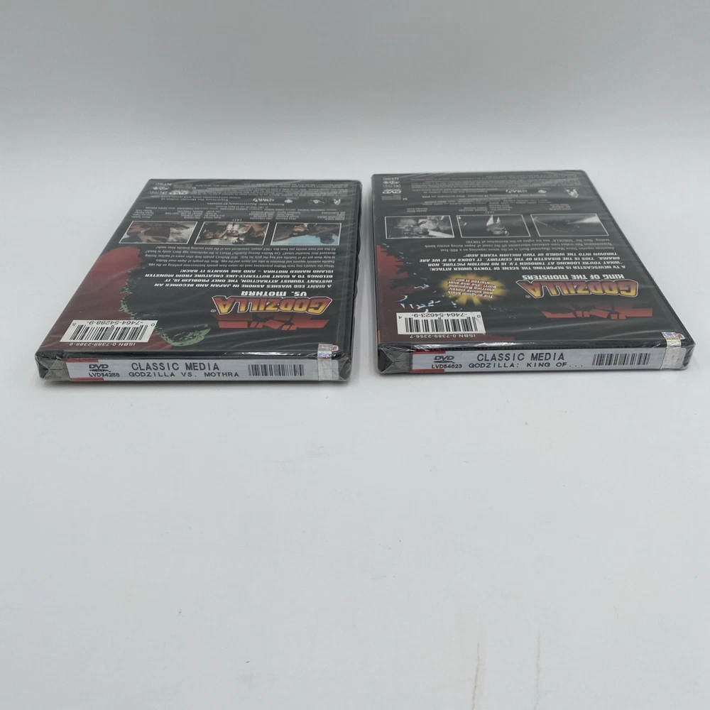 Two classic Godzilla movies on DVD including King of the Monsters and Godzilla vs Mothra. Both are new and in original seal. Mothra dvd has a small tear in the seal on the lower left as seen in photos. The king of the monsters seal appears intact. Sold as is.