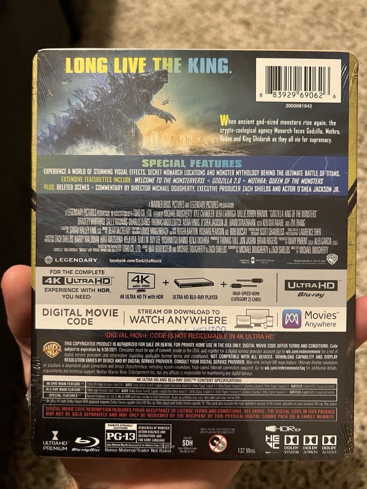 payment | shipping rates | returns Godzilla: King of the Monsters 2019 Limited Edition SteelBook (4K Ultra/Blu-ray/Digital) Product Category : DVDs UPC : 883929690626 Title : Godzilla: King of the Monsters 2019 Limited Edition SteelBook (4K Ultra/Blu-ray/Digital) Languages : pidgin_english Original Language Discs : 2 Height : 0.6000 inches Width : 5.3000 inches Length : 6.6000 inches Weight : 0.2491 pounds Condition : Very Good About hpb_movies Selling quality books and media since 1972. Customer service is our top priority! Payment We accept several payment types. They are shown above. Shipping Please click the "Shipping and Payments" tab above for details. Returns Your satisfaction is very important to us. Please contact us via the methods available within eBay regarding any problems before leaving negative feedback. You have 60 days from purchase to request a refund. © 2025 hpb_movies