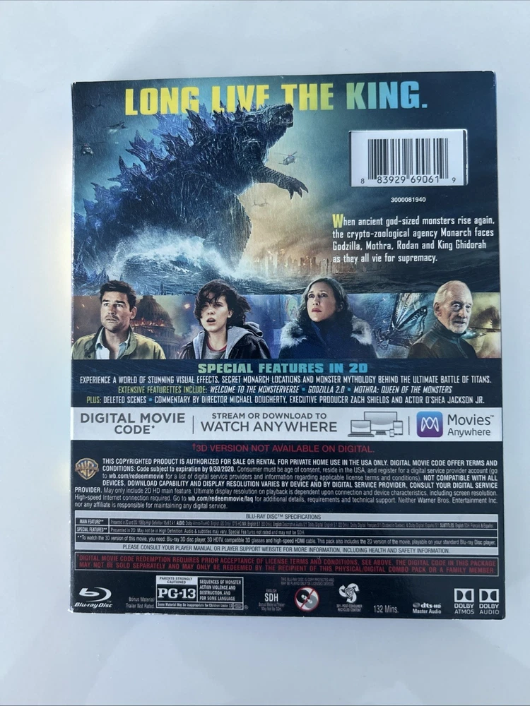 Godzilla: King of the Monsters (3D, Blu-ray, DVD, Digital, 2019) Best Buy Exclusive 3-Disc set including OOP, Rare Slipcover. All in pristine condition from a private collection. Watched Once. See pictures! This is a special edition 3-Disc Blu-ray of the 2019 monster movie "Godzilla King of the Monsters." The movie features a lot of great extra features, including commentary, deleted scenes, and behind-the-scenes featurettes. The disc includes both 2D and 3D versions of the movie, and the case is a Blu-ray case. The movie is rated PG-13 and has a run time of 132 minutes. It stars Kyle Chandler, Anthony Ramos, Millie Bobby Brown, Ken Watababe, Charles Dance, and Zhang Ziyi. The movie is in English, French, Portuguese, and Spanish, and has subtitles in those languages. The disc is region-free and has a 16:9 aspect ratio.