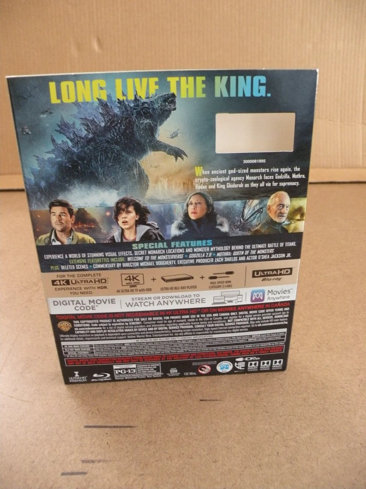 "Godzilla: King of the Monsters" is a 4K UHD/Blu-Ray movie. Directed by Michael Dougherty and starring Kyle Chandler and Vera Farmiga, it has a PG-13 rating and a runtime of 132 minutes. The film includes subtitles in multiple languages and features commentary, behind the scenes footage, and is presented in widescreen format. This standard edition release by Warner Home Video was produced by Ethan Coen and released in 2019. Selling as is, shipped securely with Tracking.