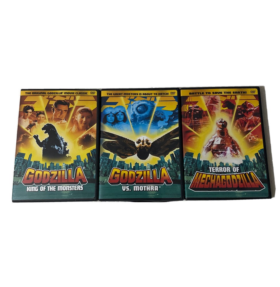 Godzilla King of the Monsters, Godzilla vs Mothra, and Terror of Mechagodzilla. 3 DVDs set/lot, all untested but in overall good condition with minor scratches/ scuffs. The Godzilla vs Mothra case is ...
