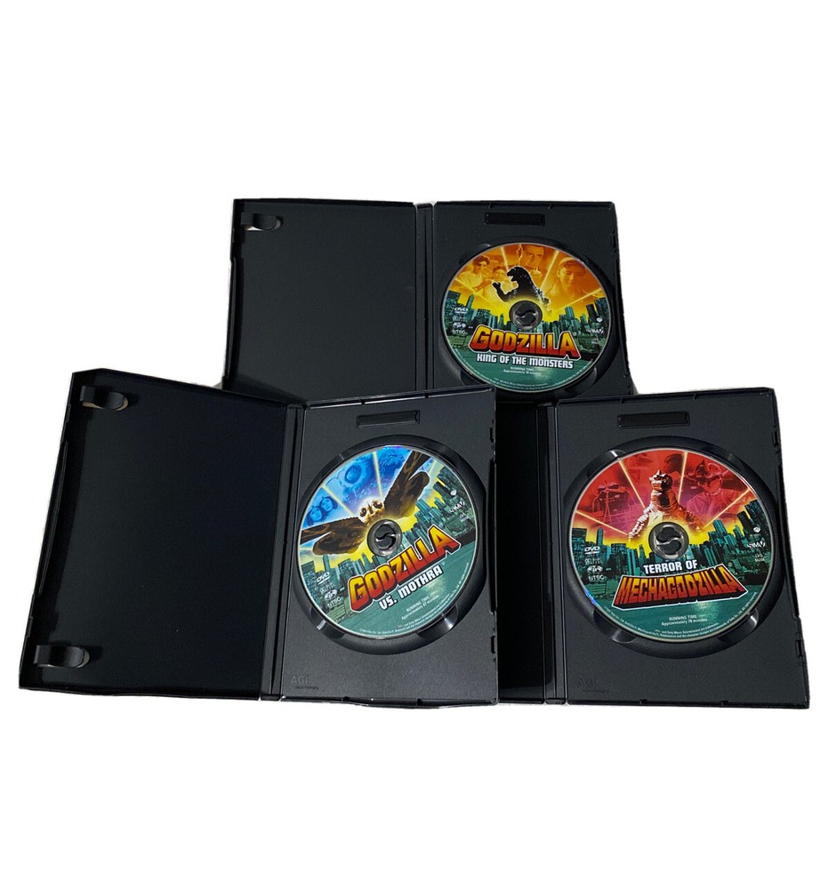 Godzilla King of the Monsters, Godzilla vs Mothra, and Terror of Mechagodzilla. 3 DVDs set/lot, all untested but in overall good condition with minor scratches/ scuffs. The Godzilla vs Mothra case is a bit bent/dented at the bottom.