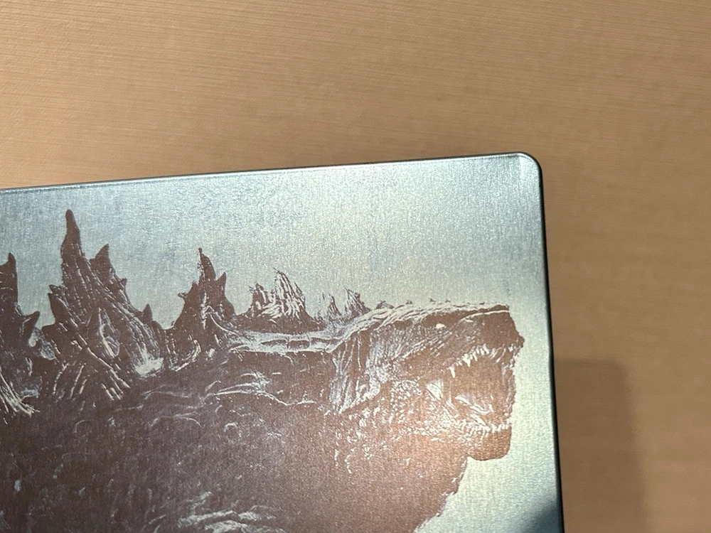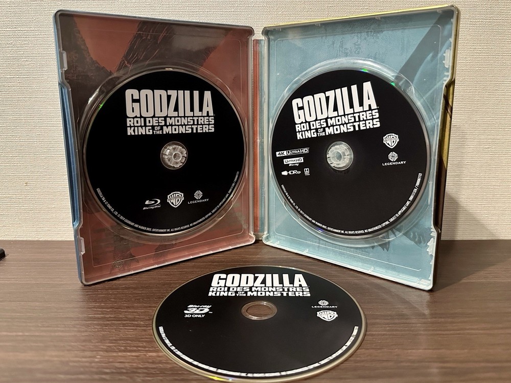 Steelbook has some mjnor dents on the bottom and corners, along with a scratch. See pictures The Godzilla King of the Monsters Steelbook 4K UHD + 3D + Blu Ray 3-Disc Set is a sought-after collector's item featuring the iconic monster Godzilla. Directed by Michael Dougherty and starring Kyle Chandler and Millie Bobby Brown, this limited edition set includes special features and is rated PG-13. The Blu-ray discs offer stunning 4K UHD visuals, and the SteelBook case adds to the overall appeal of this action-packed adventure film released by Warner Bros in 2019. Perfect for fans of creatures and monsters, this set is a must-have for any movie enthusiast.