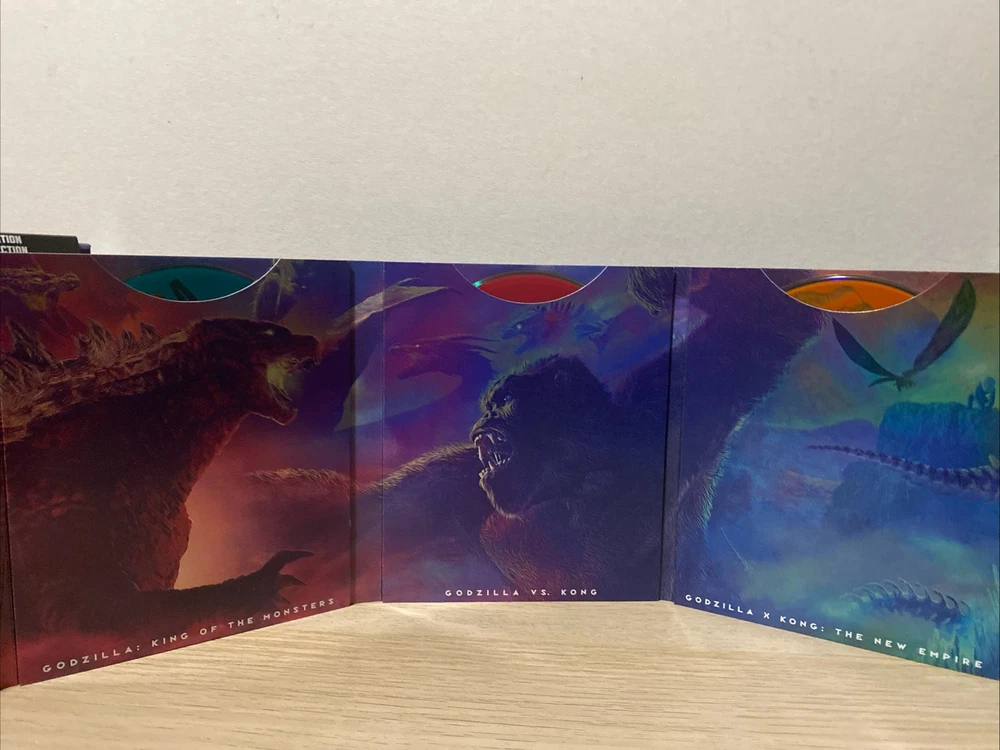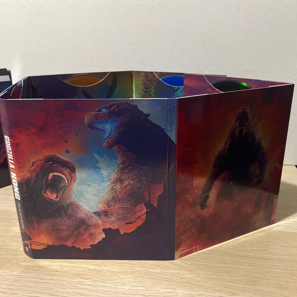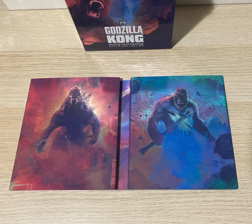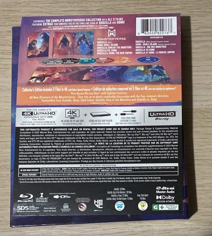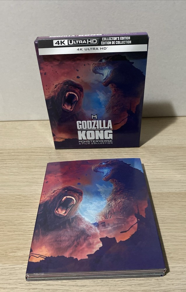 Godzilla / Kong Monsterverse 5-Film Collection (4K UHD Blu-ray) in Like New Condition. Description Godzilla (2014): This spectacular adventure pits Godzilla, the world's most famous monster, against malevolent creatures that, bolstered by humanity's scientific arrogance, threaten our very existence. Kong: Skull Island - When a scientific expedition to an uncharted island awakens titanic forces of nature, a mission of discovery becomes an explosive war between monster and man in a thrilling and original adventure that reveals the untold story of how Kong became King. Godzilla: King of the Monsters - When ancient god-sized monsters rise again, the crypto-zoological agency Monarch faces off against Godzilla, Mothra, Rodan, and King Ghidorah as they all vie for supremacy. Godzilla vs. Kong - Godzilla and Kong clash in a battle for the ages. As Monarch embarks on a mission into uncharted terrain, a human conspiracy threatens to wipe the creatures from the face of the earth. Godzilla x Kong: The New Empire - An all‐new adventure that pits the almighty Kong and the fearsome Godzilla against a colossal undiscovered threat hidden within our world, challenging their very existence—and our own. Product information Genre: Action, Adventure, Sci-Fi Format: 4K, NTSC Contributor: Adam Wingard, Kaylee Hottle, Dan Stevens, Rebecca Hall, Brian Tyree Henry Initial release date: 2024-06-25 Language: English Runtime : 9 hours and 35 minutes Studio: Warner Home Video, inc.