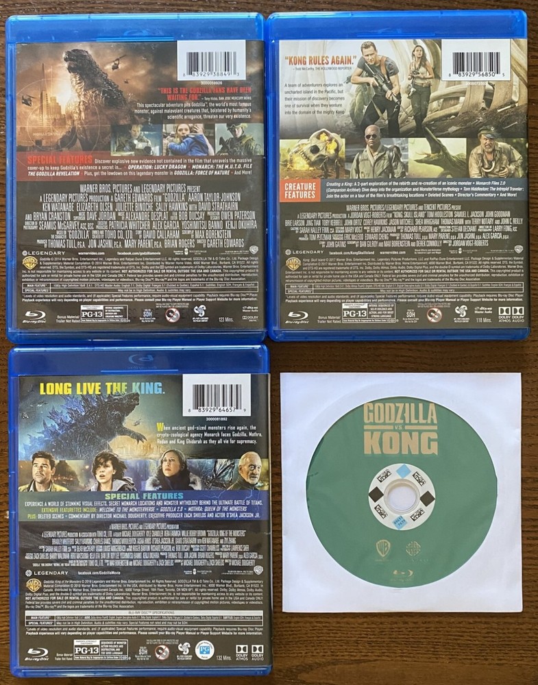 Experience the epic battles and awe-inspiring adventures with the "Godzilla, Kong Skull Island, Godzilla King of Monsters, Godzilla vs Kong" Blu-ray collection. Immerse yourself in the stunning visuals and heart-pounding action of these sci-fi and fantasy classics, where creatures and monsters collide in a race for supremacy. This set offers a high-definition journey through some of the most thrilling tales in the genre, including the iconic "Godzilla" series. Revel in the incredible performances and groundbreaking special effects that have made these films a staple in the monster movie aficionado's library. Pre-owned blu-rays, discs in like-new condition. Packaging also in like-new condition, Godzilla vs Kong comes in a white paper sleeve only as pictured. The pictures are of the copies you will actually receive. Included: Godzilla - Blu-Ray & DVD Kong: Skull Island - Blu-Ray & DVD Godzilla: King of the Monsters - Blu-Ray Godzilla vs Kong - Blu-Ray (in a white paper sleeve only as pictured)