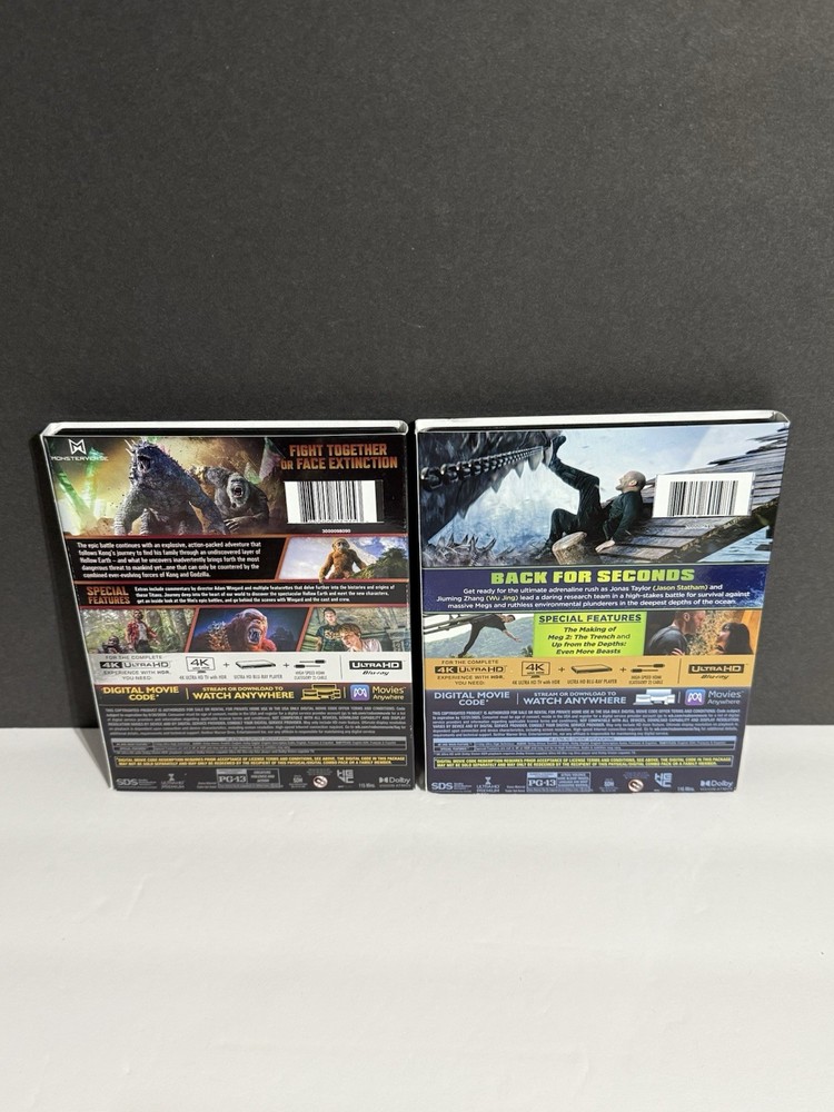 Discs untouched Only opened for digital codes The product is a lot of two 4k Ultra HD Blu-ray movies: "Godzilla vs. Kong: The New Empire" and "The Meg." Both films come with slipcovers and are in mint condition. "Godzilla vs. Kong: The New Empire" was released in 2018 and is rated PG-13. Directed by Jon Turteltaub, this action-adventure movie falls under the thriller sub-genre. "The Meg" is a film produced by Warner Home Video, providing an intense and thrilling viewing experience for fans of action and adventure movies.