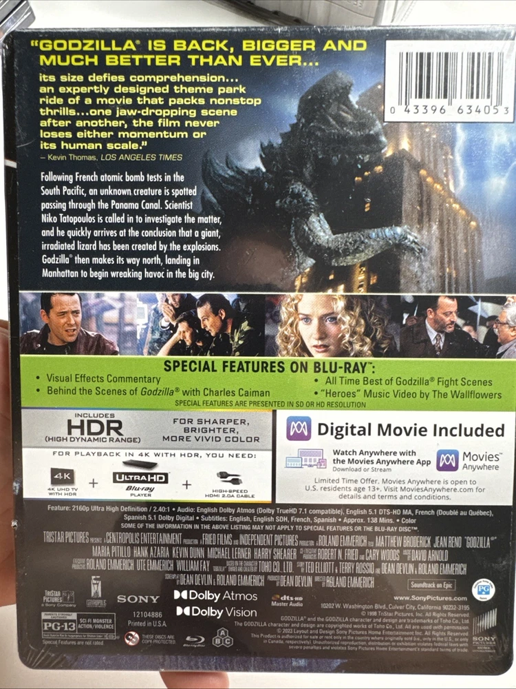 The Godzilla - Limited Edition with Steelbook case includes the 1998 movie in 4K UHD and Blu-ray formats, along with digital access. Directed by Roland Emmerich and starring Matthew Broderick, this action-packed film falls under the Science Fiction genre with a PG-13 rating. The Steelbook edition adds a touch of collectibility to this classic monster movie, making it a must-have for fans of the Godzilla franchise and movie collectors alike. With a run time of 139 minutes and additional scenes included, this limited edition release is a valuable addition to any movie enthusiast's collection.