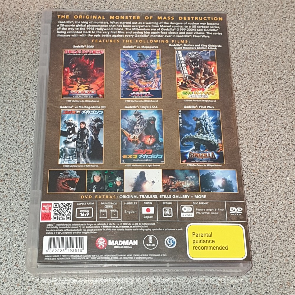 Delve into the epic confrontation between man and monster with the 2013 "Godzilla: Millennium Series" DVD 6 Disc Set, presented by Madman Entertainment. This comprehensive box set offers fans the complete experience of the iconic franchise, providing hours of entertainment with a total run time of 617 minutes. The discs are encoded for Region 4 compatibility, ensuring they're ready for play in Australia, New Zealand, and Latin America. Relish in the cinematic journey with a widescreen format that brings the battles and revelations to life in stunning detail. The series is packaged in a standard jewel case, ensuring your collection remains tidy and protected. For the foreign language aficionados, the discs come with English subtitles, allowing for an immersive viewing experience. With its PG rating, this collection is suitable for a wide audience, promising to be a valuable addition to any film enthusiast's library.