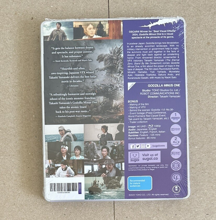 Brand new and sealed Godzilla Minus One Limited Edition Steelbook 4K Ultra HD + Blu-Ray. In postwar Japan, Godzilla brings new devastation to an already scorched landscape. With no military intervention or government help in sight, the survivors must join together in the face of despair and fight back against an unrelenting horror. From renowned director, screenwriter & VFX visionary Takashi Yamazaki (The Eternal Zero, Stand By Me Doraemon) comes Godzilla Minus One, a film about the power of home in the face of despair. The film stars Ryunosuke Kamiki, Minami Hamabe, Yuki Yamada, Munetaka Aoki, Hidetaka Yoshioka, Sakura Ando, and Kuranosuke Sasaki, with music by Naoki Sato. SPECIFICATIONS Video Resolution: Native 4K (2160p) HDR: Dolby Vision, HDR10 Aspect ratio: 2.39:1 Original aspect ratio: 2.39:1 Audio Japanese: Dolby Atmos Japanese: Dolby TrueHD 7.1 Japanese: Dolby TrueHD 5.1 Japanese: Dolby TrueHD 2.0 English: Dolby TrueHD 5.1 Audio descriptive Subtitles English, English SDH, French, Spanish Discs 4K Ultra HD Blu-ray: Region free 2K Blu-ray (x2): Region B Packaging SteelBook, Inner print Steelbook Disclaimer Please note, brand new steelbooks are inspected as best as possible from outside the shrink wrap. Any flaws identified will be listed in the ad description and photos will be provided. Imperfections like minor dents and scratches are sometimes impossible to identify without removing the shrink wrap, especially ones that are hidden under the J card. All steelbooks are wrapped in bubble wrap and packed in a cardboard box for shipping to ensure they arrive safely. Feel free to ask questions and check out my other items.