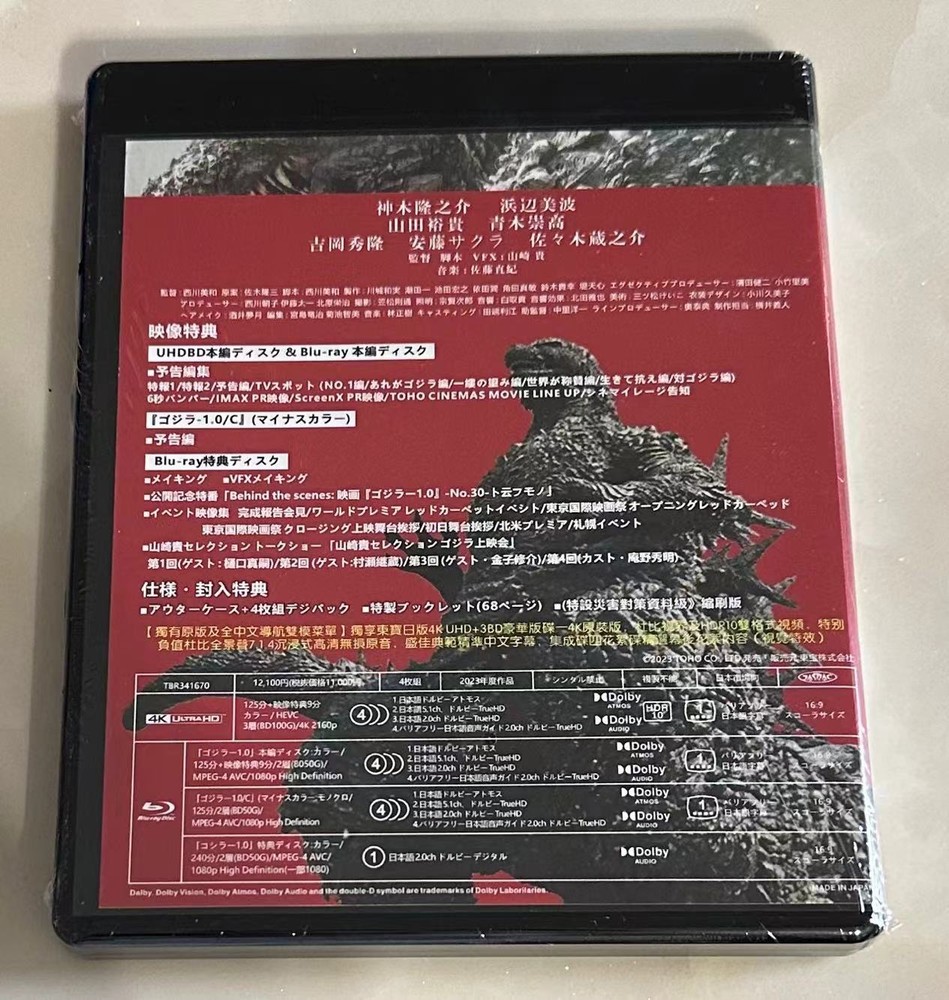 This 4K UHD Blu-ray of Godzilla Minus One is absolutely stunning! The Dolby Vision brings every terrifying detail to life, and the panoramic sound makes you feel like you're right in the action. The Japanese audio with multiple subtitle options is perfect for fans. Arrived brand new and sealed—definitely worth the wait for this high-quality release!