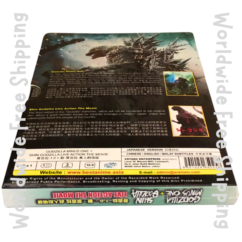 Product Description: 100% ORIGINAL, NEW AND READY STOCK Title Name: Godzilla Minus One [2023] + Shin Godzilla [2016] No of Disc: 1 Disc Language: Japanese Subtitles: English/Chinese/Malay Format: DVD (Widescreen 16:9), All Region Genres: Action, Sci-Fi Starring: Ryunosuke Kamiki, Minami Hamabe, Yuki Yamanda