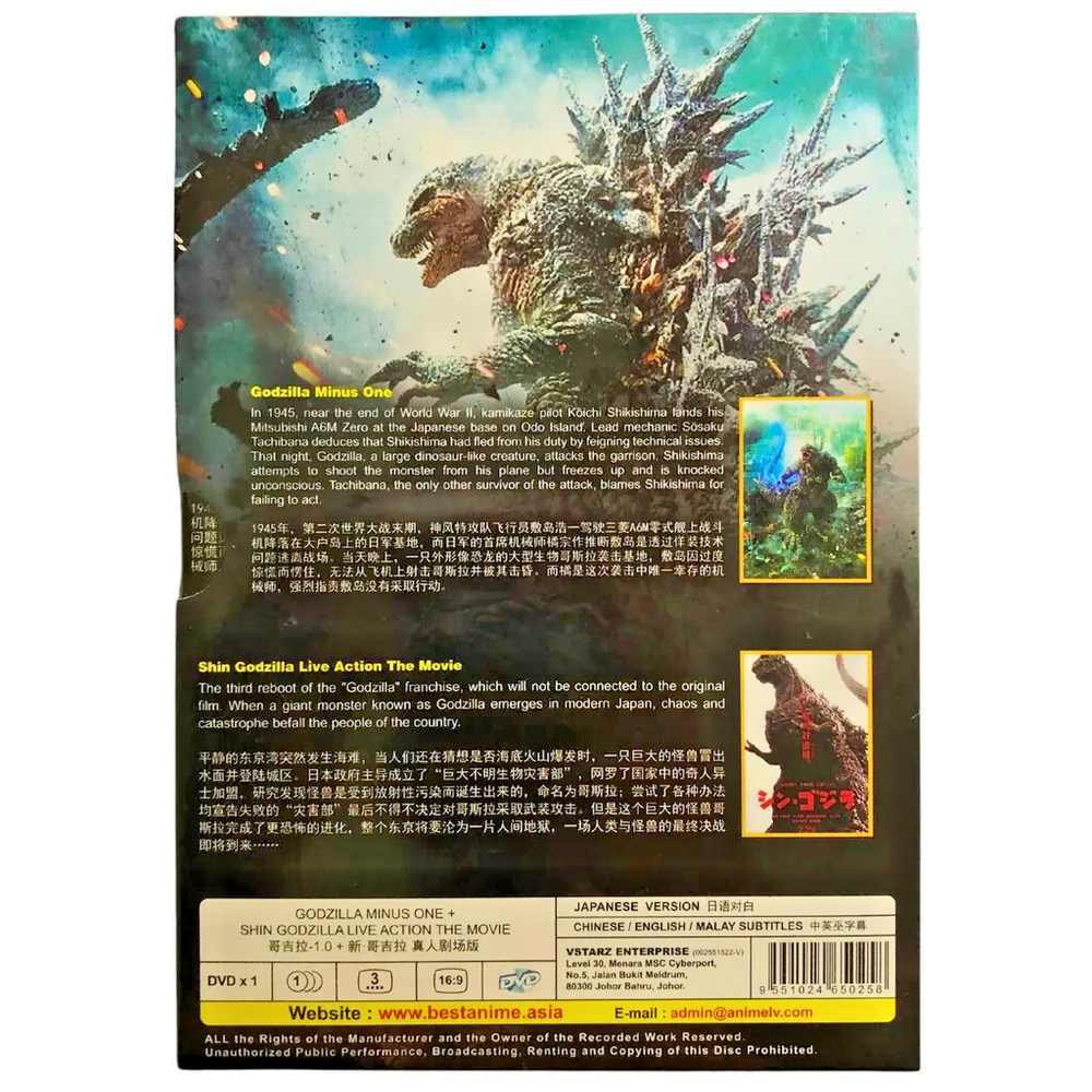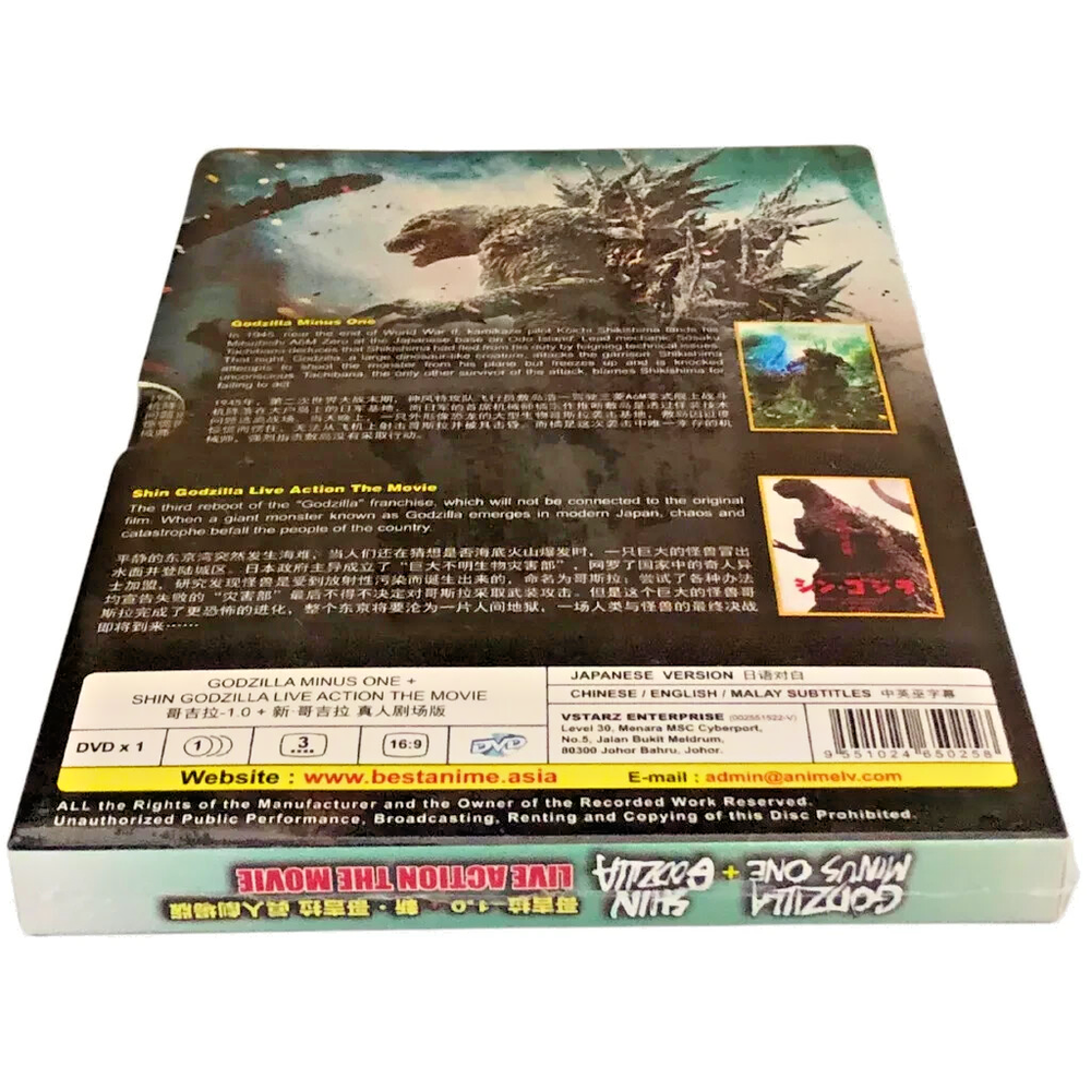 The product is a DVD set featuring the 2023 film "Godzilla Minus One" alongside the 2016 film "Shin Godzilla" in English Subtitle. Directed by Otomo Keishi, the films fall under the Japanese sub-genre of Action and Sci-Fi, with a rating of PG-13. The DVD is in Standard Edition format with an aspect ratio of 16:9, making it suitable for worldwide viewing. Starring actors like Ryunosuke Kamiki, Minami Hamabe, and Yuki Yamanda, this collection is a must-have for fans of the Godzilla franchise. Weight : 161g Product Description: 100% ORIGINAL, NEW AND READY STOCK Title Name: Godzilla Minus One [2023] + Shin Godzilla [2016] No of Disc: 1 Disc Language: Japanese Subtitles: English/Chinese/Malay Format: DVD (Widescreen 16:9), All Region Genres: Action, Sci-Fi Starring: Ryunosuke Kamiki, Minami Hamabe, Yuki Yamanda Storyline: Post war Japan is at its lowest point when a new crisis emerges in the form of a giant monster, baptized in the horrific power of the atomic bomb.