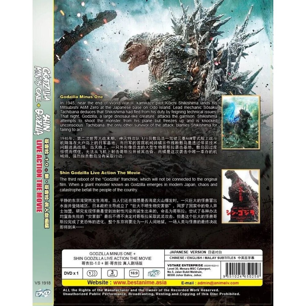Godzilla Minus One (2023 Film) + Shin Godzilla (2016 Film) New DVD [English Sub] PRODUCT DESCRIPTION - Standard Economic Shipping ( Takes Around 14-28 Days to arrive ) - Original DVDs from Licensed Publisher in Malaysia ( Certified Hologram & B-Cert ) - Solid Packaging ( Thick Bubble Wrappings ) DVD Title Name Godzilla Minus One No of Disc 1 Disc (2 Movies) Version Japanese Subtitles Chinese / English Format DVD / NTSC & All Region Code (16:9) Shipping & Payment We only Currently accept payment via eBay managed payment. We will ship your item within 1-5 business days when payment is received validly. We will ensure that the goods will be delivered within the stipulated time which is within 1 to 3 working days from Monday to Friday. for an important note that saturday and sunday are non-working days and your goods are not delivered including public holidays. We use Express Shipping service via DHL Express from Overseas with Tracking number. For items to arrive It usually takes 3-7 working days for delivery on all international orders. Sometimes it may take up to 14 working days. If your item does not arrive within the time frame, please contact us via eBay message. Economy Shipping from Overseas we use delivery service via singapore post with Tracking number. It usually takes 11-35 working days for delivery on all international orders. Sometimes it may take up to 30 working days to arrive. If your item does not arrive within the time frame, please contact us via eBay message. All products are packed, and layered with bubble wrap to reduce damages during shipment delivery. To ensure the delivery can be processed smoothly, make sure your delivery address is verified and correct. We will contact you via ebay message to confirm the address to be sent to. We are not responsible for invalid addresses. Worldwide shipping are available. Custom Import duties, taxes and additional charges are not included in the item price or shipping charges. Please note that these custom import duties and taxes are the buyer's responsibility. Please check with your country's customs before you buy. All customs fees & taxes will be borne by the buyer. sometimes items are delayed due to customs. please allow some time for your country's customs clearance time, because the delay usually comes from Customs. If there is a loss during delivery, the seller will not be responsible, but the seller will help to track the item. For proof of delivery, the seller will keep Return If you have any problem with the order, do contact us via eBay message. we are glad to assist you and solve the problem as soon as possible. Items can be returned within 30 days in a good condition. Remote Area If you are part of a Remote Area, additional charges apply. A message will be sent to you for further discussion. Contact us If you have any questions, you can contact us via eBay message. We will ensure that the customer is our priority and if you are satisfied with our service, we sincerely hope that you will give us positive feedback. Our mission is to make sure buyers are satisfied with the support of our store. If there is a problem with your order, please contact us before leaving any negative or neutral feedback. We will do our best to solve the problem for you.