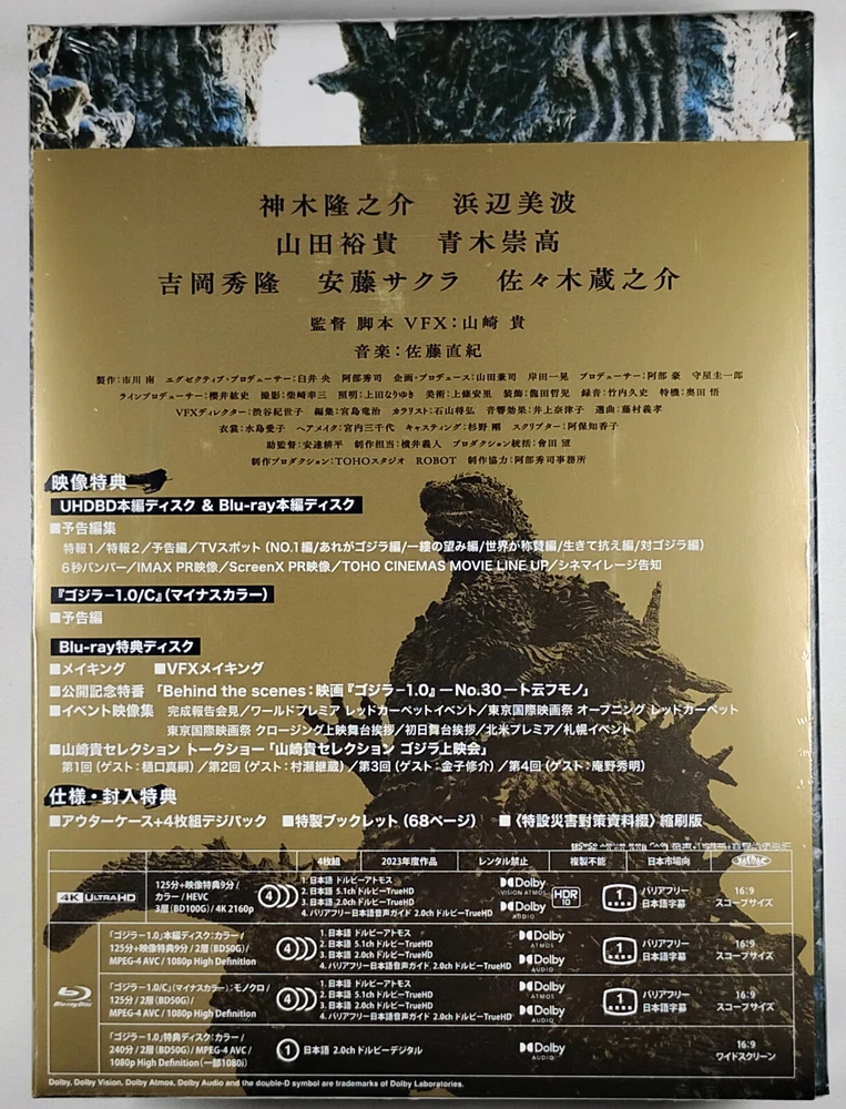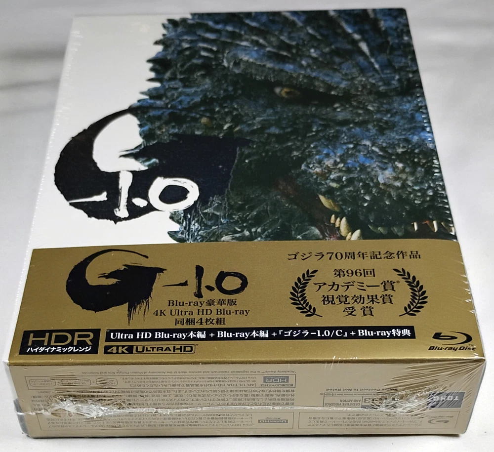 For sale: "Godzilla Minus One" (2023) on 4K Ultra HD + Blu-ray (4-disc set) This is the Japanese Collector's Edition that has been re-coded for the North American market with some added English functionality, sold by the Godzilla store. The booklets that are inside are in Japanese and are not translated. Disc One: Godzilla Minus One on 4K UHD Japanese audio only, English subtitles, English menus Disc Two: Godzilla Minus One on Blu-ray Japanese audio only, English subtitles, English menus Disc Three: Godzilla Minus One (Minus Color / black and white) Blu-ray Japanese audio only, English subtitles, English menus Disc Four: Special features Blu-ray Japanese language only (no English functionality) This item is brand new and factory sealed. 4K discs do not have region-coding, so the 4K disc will play on 4K players worldwide. The standard (2D) Blu-ray discs are Region A. This item will ship from the United States. International Buyers – Please Note: Import duties, taxes, and charges are not included in the item price or shipping cost. These charges are the buyer's responsibility. Please check with your country's customs office to determine what these additional costs will be prior to bidding or buying.