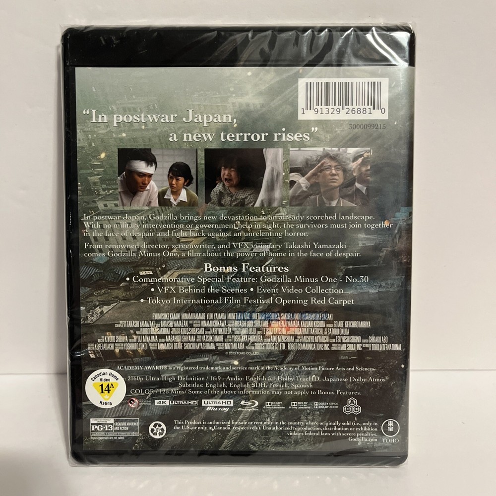 Just got my hands on this 4K UHD Blu-ray and wow—Godzilla Minus One looks absolutely incredible! The visuals are razor-sharp, the action is intense, and the sound design pulls you right into the chaos. Toho really delivered with this one—every scene pops with detail, making it a must-watch for any kaiju fan. The PG-13 rating keeps it thrilling without going overboard. If you love Godzilla or just want a top-tier 4K experience, grab this while it's sealed—you won’t regret it!