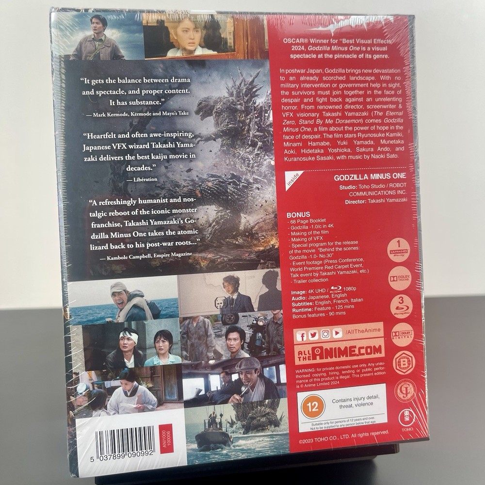Godzilla: Minus One (4K UHD•Blu-ray, 2024) Deluxe Collector’s Edition. The 4K disc can be played on any 4K player but the Blu-ray is Region B locked and requires a Region Free player to be viewed. Condition is Brand New. Shipped Free, bubble wrapped in a box, the next day. FEATURES: 64-page booklet Collector's packaging Godzilla Minus One / Minus Color Making of the film Making of VFX Special program for the release of the movie “Behind the scenes: Godzilla -1.0- No.30 Toifumono Event footage (Press Conference, World Premiere Red Carpet Event, Talk event by Takashi Yamazaki, etc.) Trailer collection
