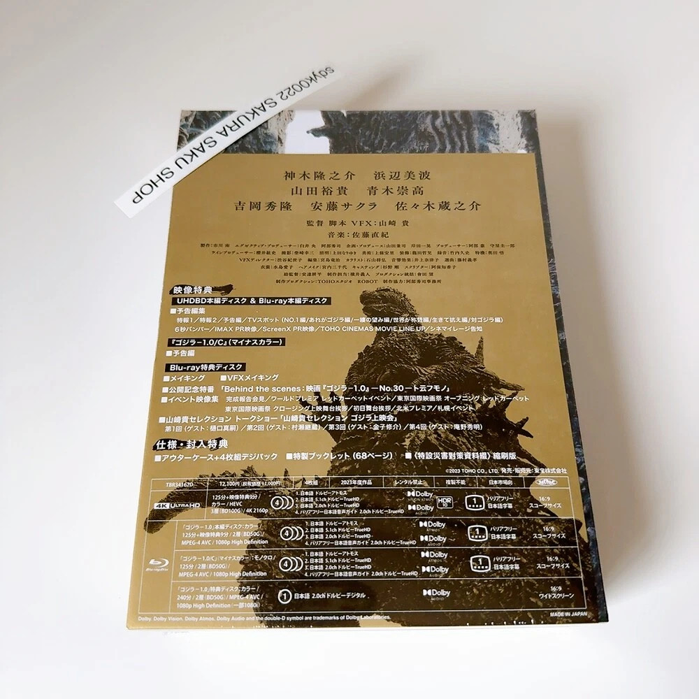 Godzilla Minus One Deluxe Edition 4K UHD Blu-ray + 3BD Region free Godzilla-1.0 Description New Title: Godzilla Minus One Deluxe Edition 4K Ultra HD Blu-ray Product Type: 4K UHD Blu-ray, 3Blu-ray (Region: free) Number of Discs: 4 Director: Takashi Yamazaki Writer: Takashi Yamazaki Starring: Ryunosuke Kamiki, Minami Hamabe, Munetaka Aoki, Hidetaka Yoshioka, Sakura Andô, Kuranosuke Sasaki Producer: Kenji Yamada Color: Color Running Time: 125 minutes Original Release Year: 2023 Aspect Ratio(s) 16:9 Scope Subtitles: Japanese Subtitles for the Hearing Impaired Audio Track: Japanese Dolby Atmos, Japanese Dolby TrueHD 2.0ch, Japanese Dolby TrueHD 5.1ch, Japanese Audio Guide for the Visually Impaired Dolby TrueHD 2.0ch 4K UHD Blu-ray release of "Godzilla Minus One (Godzilla -1.0)", a 2023 Japanese sci-fi action film directed, written, and with visual effects by Takashi Yamazaki. It is Toho's 33rd Godzilla film and stars Ryunosuke Kamiki. In the film, postwar Japan deals with the emergence of Godzilla... [Spec/Bonus] - 4-disc digipak + Outer case - Special booklet - <Special disaster countermeasure materials> Reduced edition [Contents] Disc 1: 4K Ultra HD Blu-ray Disc 2: Blu-ray Disc 3: Blu-ray: Godzilla Minus One/C (black-and-white version) Disc 4: Blu-ray: Bonus Disc (making-of, VFX making-of, promotional TV special "Behind the scenes - No.30 - To Iu Mono," and event footage collection) [Trailer collection (Disc 2)] - Special News 1・2 - Trailer - TV spot - 6 seconds bumper - IMAX PR video - ScreenX PR video - TOHO CINEMAS MOVIE LINE UP - Cinemileage announcement *Ultra HD Blu-ray player is necessary to play this Ultra HD Blu-ray disc. Please note that it will not play on regular Blu-ray player. For optimal viewing experience of 4K UltraHD content, 4K/HDR TV is recommended, although it is also compatible with 4K TV and HV TV. Payment Please pay within 5 days after the auction closed. We will ship the item within 5 business days after your payment clears. Shipping This item will be shipped from JAPAN. Please check the shipping method in the Shipping Policy for that item. If you have any questions, please contact us anytime. About other areas, please ask us. Returns Returns are accepted ONLY if the item was not the item described. International Buyers - Please Note: * Import duties, taxes, and charges aren't included in the item price or postage cost. These charges are the buyer's responsibility. "Please check with your country's customs office to determine what these additional costs will be prior to bidding or buying. * We do not mark merchandise values below value or mark items as "gifts" - US and International government regulations prohibit such behavior. Thank you for your understanding in advance.