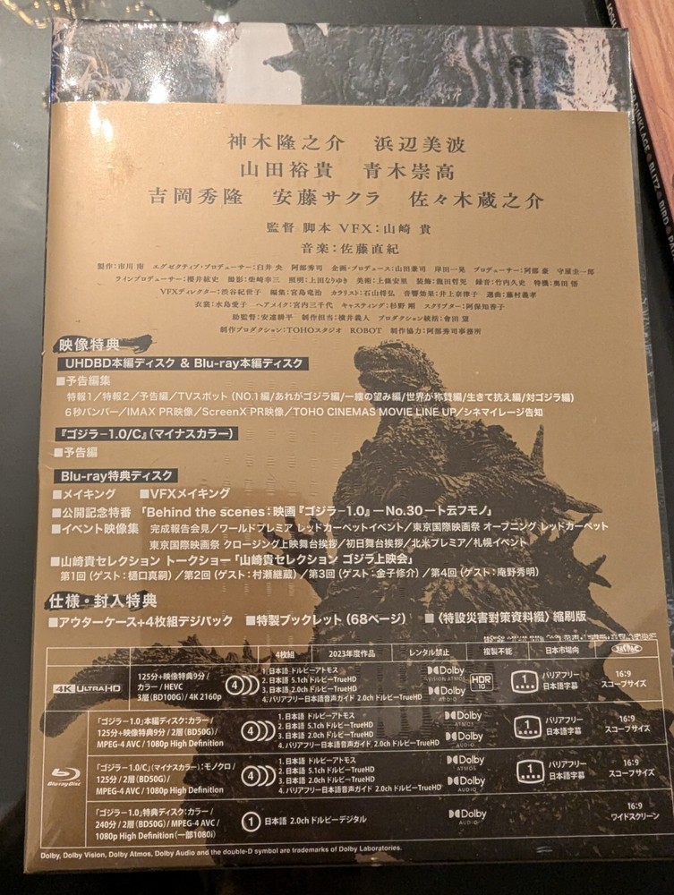 Godzilla Minus One Deluxe Edition 4K Ultra HD+3 Blu-ray+2 Booklet+Case Japanese. This limited edition set includes a 4K UHD Blu-ray disc, three Blu-ray discs, a special booklet, and an outer case. The set features the first season of the Japanese movie "Godzilla Minus One", directed by Yamazaki Takashi and starring Kamiki Ryunosuke, Hamabe Minami, and Ando Sakura. The set is region-free and includes Japanese language options. The set is brand new and still in its original packaging.