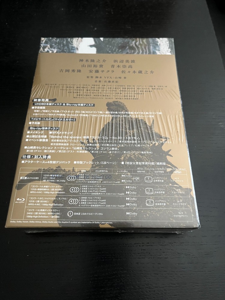 Godzilla Store Exclusive Featuring Both Godzilla Minus One and Godzilla Minus One/Minus Color BThis Godzilla Store Exclusive mirrors the deluxe 4-disc bluray box set released on May 1, 2024 in Japan, and includes both Godzilla Minus One and Godzilla Minus One/Minus Color. Preserving the Japanese treatment in both packaging and content, the “Deluxe Japan Collector’s Edition” includes all the same features as the original Japan release with the added addition of English menus and the option to select the theatrical release English subtitles for Godzilla Minus One and Godzilla Minus One/Minus Color. Full details of each disc content: Disc 1: Godzilla Minus One 4K Ultra HD Blu-ray 125 minutes / 3 layers (100G) / 4K 2160p 16:9 scope size / Dolby Vision Audio: (1) Japanese Dolby Atmos (2) Japanese 5.1ch Dolby TrueHD (3) Japanese 2.0ch Dolby TrueHD (4) Barrier-free Japanese audio guide 2.0ch Dolby TrueHD Subtitles: (1) Barrier-free Japanese subtitles (2) English subtitles (3) Spanish subtitles Disc 2: Godzilla Minus One Blu-ray 125 minutes / Trailer compilation / 2 layers (BD50G) / 1080p High Definition 16:9 scope size Audio: (1) Japanese Dolby Atmos (2) Japanese 5.1ch Dolby TrueHD (3) Japanese 2.0ch Dolby TrueHD (4) Barrier-free Japanese audio guide 2.0ch Dolby TrueHD Subtitles: (1) Barrier-free Japanese subtitles (2) English subtitles (3) Spanish subtitles Trailer Collection (Japanese language only) Special Announcements 1 & 2 Trailer TV Spot No. 1 Edition/That's Godzilla Edition/A Glimmer of Hope Edition/The World Praises Edition/Live and Resist Edition/Against Godzilla Edition 6-Second Bumper IMAX PR Video ScreenX PR Video TOHO CINEMAS MOVIE LINE UP Cinema Mileage Announcement Disc 3: Godzilla Minus One/Minus Color Blu-ray Main feature 125 minutes / Godzilla-1.0/C trailer / 2 layers (BD50G) / 1080p High Definition 16:9 scope size Audio: (1) Japanese Dolby Atmos (2) Japanese 5.1ch Dolby TrueHD (3) Japanese 2.0ch Dolby TrueHD (4) Barrier-free Japanese audio guide 2.0ch Dolby TrueHD Subtitles: (1) Barrier-free Japanese subtitles (2) English subtitles (3) Spanish Subtitles Disc 4: Bonus Blu-ray (Japanese language only) Recording length: 240 minutes / 2 layers (BD50G) / 16:9 / 1080p High Definition (some 1080i) Audio: Japanese 2.0ch Dolby Digital Subtitles: NOTE - NO ENGLISH SUBTITLES <Contents (Bonus DISC)> Making of VFX Making of Release commemorative special program "Behind the scenes: The movie "Godzilla-1.0" -No.30- Event footage: September 4, 2023: Completion report press conference October 18, 2023: World premiere red carpet event October 23, 2023: Tokyo International Film Festival opening red carpet November 1, 2023: Tokyo International Film Festival closing screening stage greetings November 3, 2023 (National Holiday): Opening day stage greetings November 8-10, 2023: North American premiere November 29, 2023: Sapporo event Yamazaki Takashi Selection Talk Show September 15, 2023: "Yamazaki Takashi Selection Godzilla Screening" 1st (Guest: Higuchi Shinji) Friday, September 29, 2023: "Yamazaki Takashi Selection Godzilla Screening" Vol. 2 (Guest: Murase Keizo) Friday, October 13, 2023: "Yamazaki Takashi Selection Godzilla Screening" Vol. 3 (Guest: Kaneko Shusuke) October 27, 2023: "Yamazaki Takashi Selection Godzilla Screening" Vol. 4 (Guest: Anno Hideaki) Specifications and Enclosures: 4-disc Digipack + outer case specifications Special booklet (Japanese language only) “Special Disaster Response Materials Compilation” Abridged version (Japanese language only)