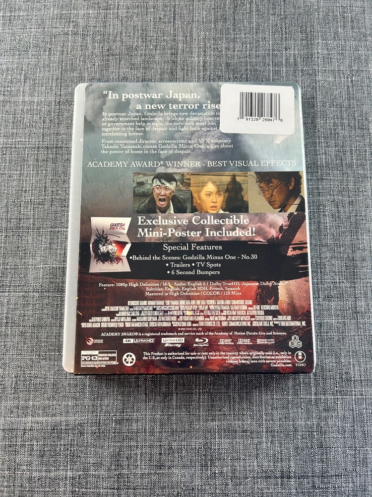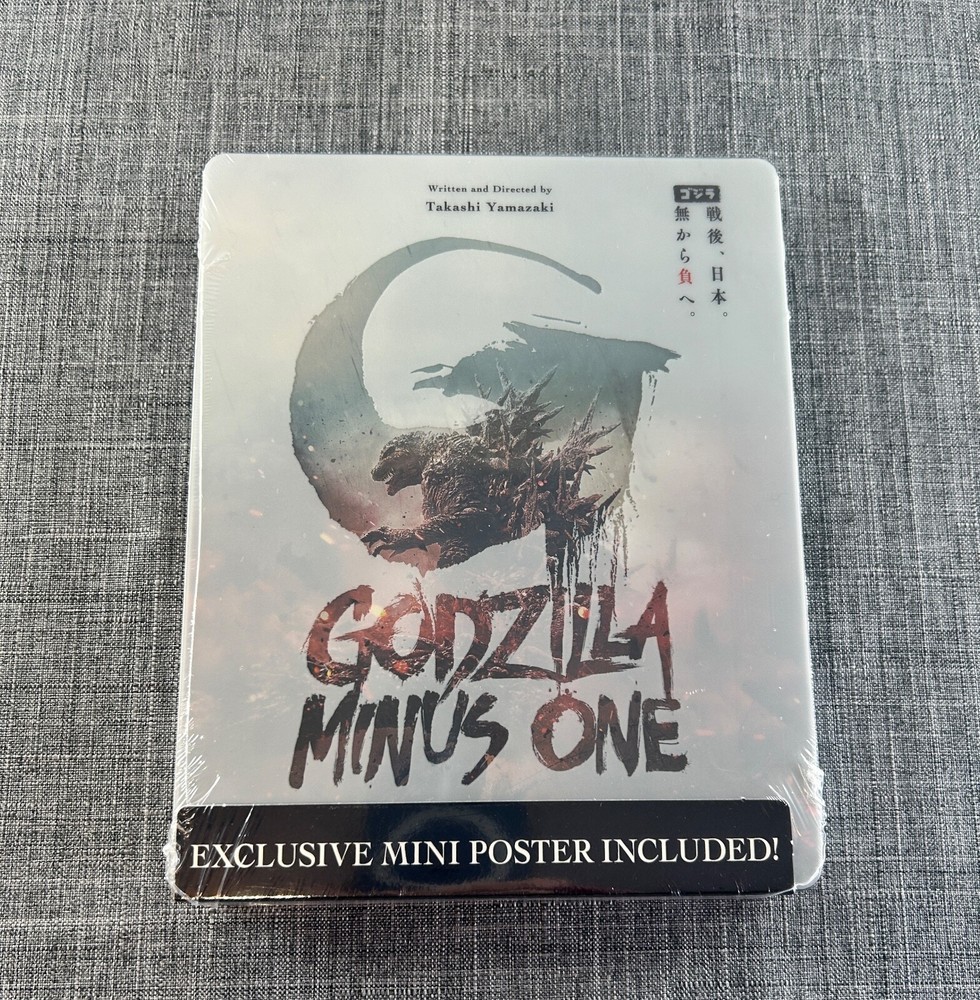 SHIPS IN A BOX Godzilla Minus One 4K Blu-ray SteelBook / 4K Ultra HD + Blu-ray Toho | 2023 | 125 min | Rated PG-13 | Nov 19, 2024 Video Codec: HEVC / H.265 (69.80 Mbps) Resolution: Native 4K (2160p) HDR: Dolby Vision, HDR10 Aspect ratio: 2.39:1 Original aspect ratio: 2.39:1 Audio Japanese: Dolby Atmos Japanese: Dolby TrueHD 7.1 (48kHz, 24-bit) Japanese: Dolby TrueHD 5.1 Japanese: Dolby TrueHD 2.0 English: Dolby TrueHD 5.1 Audio descriptive Subtitles English, French, Japanese, Spanish Discs 4K Ultra HD Blu-ray Disc Three-disc set (1 BD-100, 2 BD-50) Packaging Slipcover in original pressing SteelBook, Inner print Figure/replica/props/memorabilia included Playback 4K Blu-ray: Region free 2K Blu-ray: Region free Godzilla Minus One 4K (2023) Shikishima, a surviving Kamikaze pilot, is attacked on Odo Island along with many war plane engineers by a gargantuan monster. After surviving, Shikishima, now on a personal mission, teams up with a large group of veterans to finally take down the monster known as Godzilla.