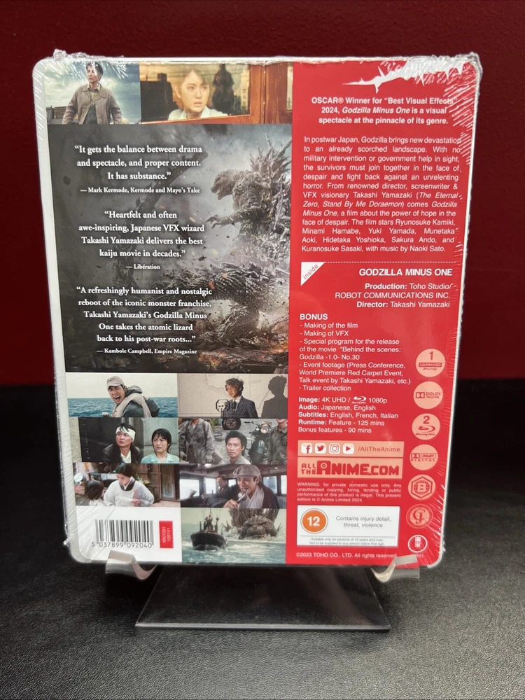 GUARANTEE YOURSELF A COPY OF THIS STEELBOOK BEFORE IT SELLS OUT! Limited Edition UK, English Audio and Subtitles BONUS In the box: Steelbook packaging On disc (w/ English, French and Italian subtitles): Making of the film Making of VFX Special program for the release of the movie “Behind the scenes: Godzilla -1.0- No.30 - Toifumono Event footage (Press Conference, World Premiere Red Carpet Event, Talk event by Takashi Yamazaki, etc.) Trailer collection Region Code: 4K Region free / Standrad Disc Region B Duration: 125 minutes Original Language: Japanese Extras: Language(s): Japanese, English, Subtitles: English, French, Italian, Interactive Menu, Behind the Scenes, Bonus Footage, Making of Documentary, Event footage (Press Conference, World Premiere Red Carpet Event, Talk event by Takashi Yamazaki), Trailers WELCOME TO DARK WOODS MEDIA ALL STEELBOOKS COME WITH PROTECTIVE SLEEVES Please follow us as a seller and see our other products in our store, we carry hundreds of titles and we specialize in collector Steelbooks. You will receive what you see in the pictures, we do not use stock photos when the item is released. All Steelbooks are thoroughly inspected in a two step process and described in as much detail as possible if there are any imperfections and will be stated in the title and description. I will attach as many pictures as possible showing any imperfections if present. All Steelbooks come with premium shipping complete with protective sleeves bubble wrap and premium boxes for safe shipment. We do not sell anything with loose discs and can't be held responsible for discs coming loose during shipment. We strive for the best customer service and your feedback is important to us, if you have any questions or issues please contact us first before leaving negative feedback, we will take care of the issue. Please inspect the item before opening as we DO NOT accept open items back for return. Handle time is 1 day for prompt payment. Payment is due within 4 days of purchase date. We have 100% positive feedback and you won't be disappointed. THANK YOU FOR LOOKING AND YOUR BUSINESS