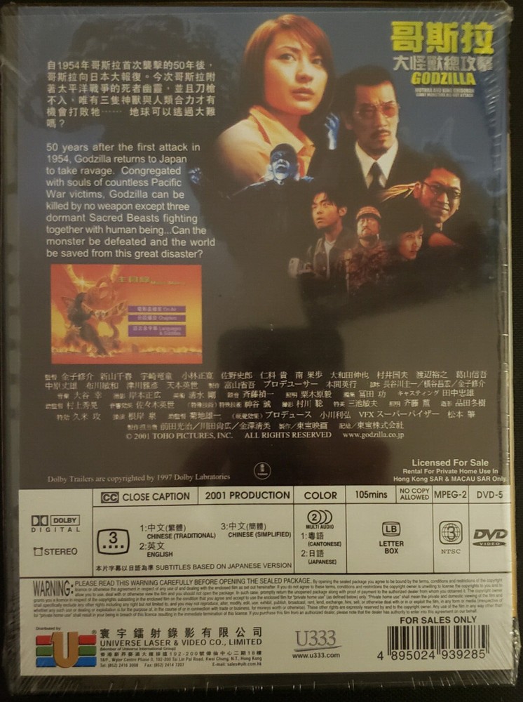 Godzilla, Mothra And King Ghidorah: Giant Monsters All-Out Attack (DVD, 2001 Region 3) New, Factory Sealed. Note: You must have a DVD/Blu-Ray player that plays Region 3 discs or a Region Free player. ...