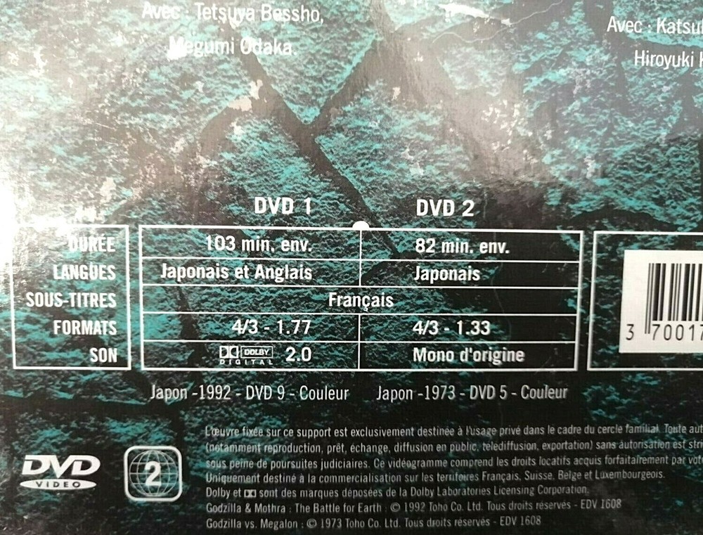 Don't buy this unless you have REGION-FREE DVD PLAYER in America/Canada. Or if you live in Europe = region 2 PAL format DVD.*** Godzilla and Mothra DVD 1 is in Japanese and English w French subtitles. Godzilla vs. Megalon DVD 2 is in Japanese only w French subtitles. Ships fast with USPS tracking. Careful packing.