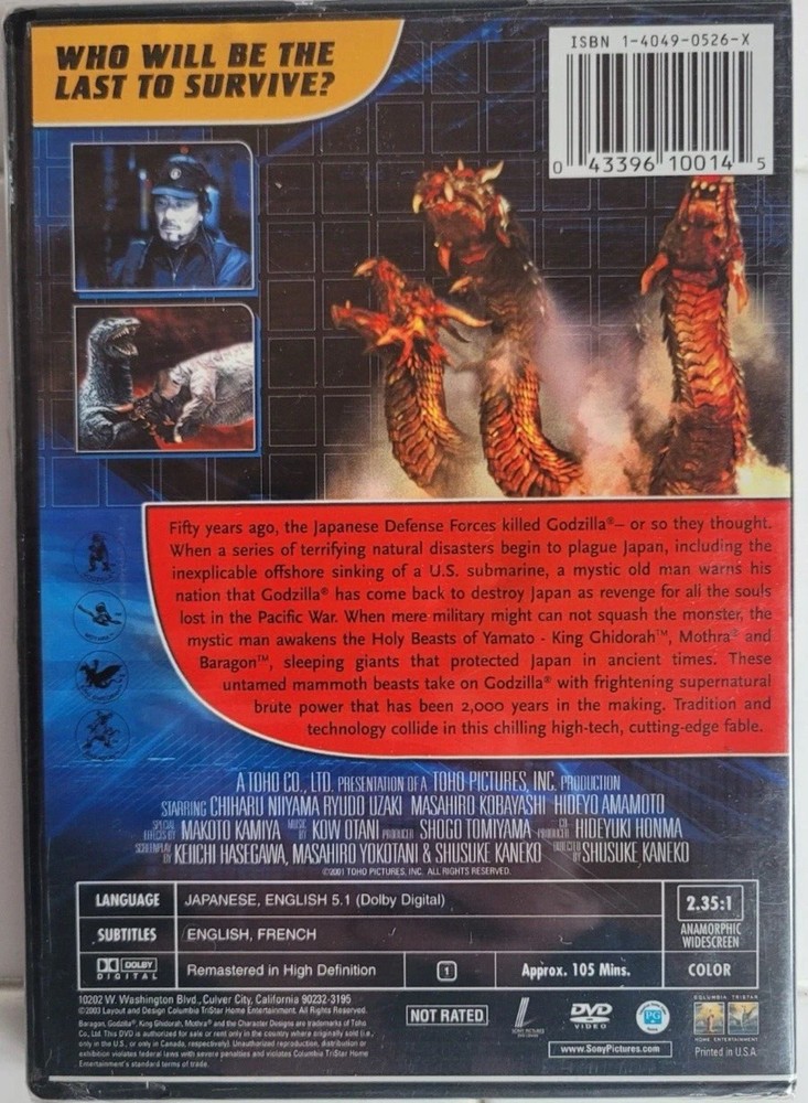 Experience the thrilling excitement of the 2004 classic, "Godzilla, Mothra, and King Ghidorah: Giant Monsters All Out Attack" on DVD. This widescreen edition directed by Shusuke Kaneko features all the fantastic elements that make this movie a must-see for fans of creatures and monsters. Join the giants as they battle it out in this action-packed sci-fi and fantasy film. Get your copy today and enjoy the spectacular spectacle that is sure to leave you in awe.