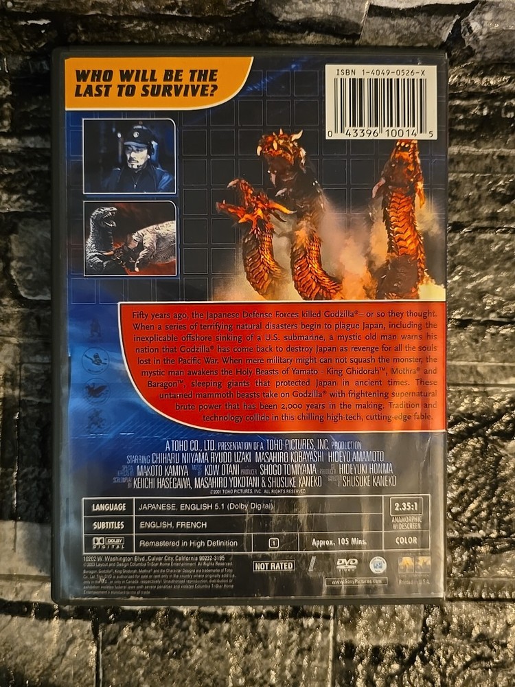 Pre-owned Both Discs have cracks near center hole and surface imperfections (see photos) For fans of Japanese sci-fi and fantasy, this DVD lot is a must-have. Featuring the films "Godzilla, Mothra, and King Ghidorah: Giant Monsters All Out Attack" and "Godzilla Against Mechagodzilla ," this collection is sure to satisfy your craving for epic battles and awe-inspiring monsters. The movies are in DVD format with region code 1 (US, Canada...) and were released in 2004. The director behind "Godzilla, Mothra, and King Ghidorah: Giant Monsters All Out Attack" is Shusuke Kaneko, and the films are rated NR. The sub-genres include creatures/monsters and Japanese, while the genre is sci-fi and fantasy. Add this DVD lot to your collection and relive the thrilling battles between the beloved monsters. PLEASE CHECK PHOTOS CAREFULLY FOR CONDITION, MEASUREMENTS, and COLOR *Please ask any questions or request additional information before purchasing ** Please check photos carefully for item and condition *** Colors may vary due to lighting conditions or screen resolution πΊπΈ FAST SHIPPING πΊπ² PLEASE REMEMBER TO LEAVE A POSITIVE βββββ FEEDBACK. ** A 20%+ restocking fee will be deducted for all returns, not in original condition ** If there are any problems, please reach out to me before opening a return claim. ** Buyer Is Responsible For The Shipping Cost Of The Returned Item. ** Please Use Delivery Confirmation. ** Only The Cost Of The Item Will Be Refunded ** Shipping Cost Will Not Be Refunded ** If free shipping, the original shipping cost will be deducted from the refund amount. ** Item Must Be In The Same Condition It Was Sent Thank you. ORANGE PICKERS and RESALE π π π π π π