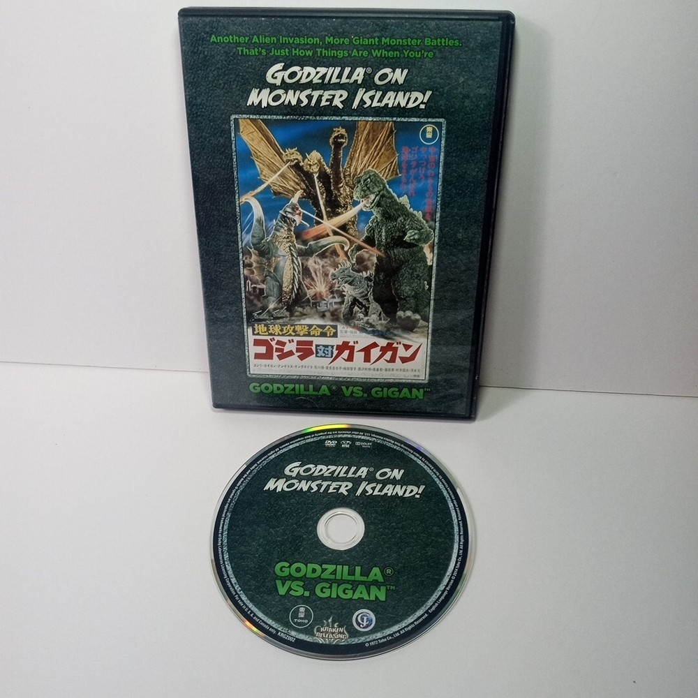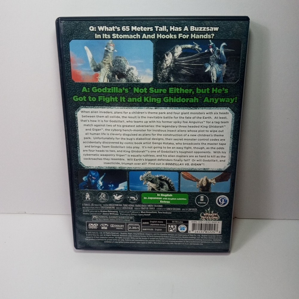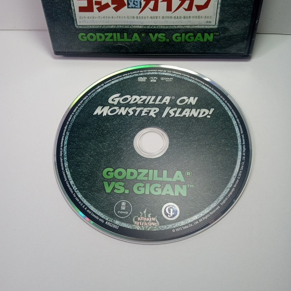 You see all photos for condition the movie case is in good condition normal wear and tear the disc is in very good condition with a few minor scratches thanks for looking This DVD features the 1972 classic "Godzilla Vs. Gigan" directed by Jun Fukuda. The film is presented in NTSC video format and comes in a tall/DVD case. It has a PG rating and includes subtitles in English and Chinese. The DVD is an edition from Kraken Releasing and has an aspect ratio of 16:9. The movie stars Godzilla, Tomoko Umeda, and Hiroshi Ishikawa and features original dubbing, full screen, and is dubbed with subtitles. The DVD is a limited edition and has a release year of 2014. It is a sci-fi and fantasy genre movie with Japanese sub-genre and cinematic movement. The DVD is region code 1 (US, Canada...) and is a unit type DVD.