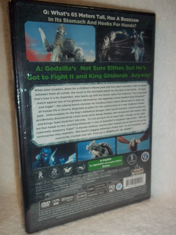 PLEASE READ BELOW BEFORE BIDDING AND ASKING ANY QUESTIONS ITEM DESCRIPTION This DVD is previously viewed but in EXCELLENT condition. The disc(s) is LIKE NEW. It includes all the original cases, covers, inserts and, of course, the disc(s) itself. Synopsis: Godzilla On Monster Island: Godzilla and Angorus fight three-headed dragon Ghidrah and huge bird Gigan at a cartoonist's theme park. Godzilla Vs Gigan: Godzilla and Angorus fight three-headed dragon Ghidrah and huge bird Gigan at a cartoonist's theme park. OUR TERMS AND GUARANTEES We will contact the auction winner(s) via email within 24 hours of auction close with any specific instructions that may be necessary to complete the transaction. We will also notify the auction winner(s) when their order has been shipped by sending an email to their ebay email address. WE DO NOT SELL illegal bootleg tapes, copies, screeners, or any type of illegally burned CDs/DVDs! ALL ITEMS ARE FACTORY ORIGINALS and, unless otherwise noted, include their ORIGINAL US factory made cases, inserts/game book and, of course, the items themselves. All DVDs are GUARANTEED. If you receive a damaged, defective or otherwise unusable item from us, please inform us within 15 days of shipment and we will replace the defective product. In the event that the defective item is no longer available, we will substitute for another item, credit your account or issue a refund minus the Shipping. Buyer must make contact within 3 days of the end of auction and payment must be made within 10 days of the end of auction. Please have funds ready to send when you are bidding. Your personal information will never be shared or sold to anyone. Your transaction is strictly confidential, and you will receive your product in discreet packaging . Finally, there should NEVER be a reason to leave us negative feedback. That is NOT the proper way to get our help with a problem, just contact us and give us a chance to provide an appropriate solution. Permanently hurting our reputation by leaving us negative feedback or threatening negative feedback will NOT get you the service you are looking for, again, just email us if you have a problem with your purchase. PAYMENT TERMS Payment is expected within 10 days after the auction closes. Please include the following with your payment: Username Auction number(s) Item name Shipping Address We accept the following forms of payment: . PAYPAL Credit Cards (Contact us for details) SHIPPING TERMS Your DVD(s) will be shipped within 48 hours of receipt of payment. All DVDs will be shipped discreetly . The flat rate shipping fee using USPS FIRST CLASS MAIL is $ 3.00 for the 1st DVD, $2.00 for each additional within the USA . International orders, INCLUDING CANADA, using USPS AIRMAIL are $20.00 for the first DVD, $5 for each additional. Rush and Expedited shipping options are available to most areas; please feel free to contact us for pricing and other details regarding the auction. I COMBINE SHIPPING Please View Our Other Auctions And Save On Shipping Powered by SixBit's eCommerce Solution