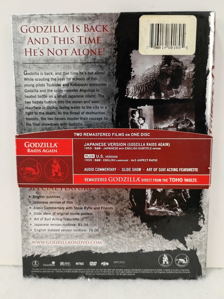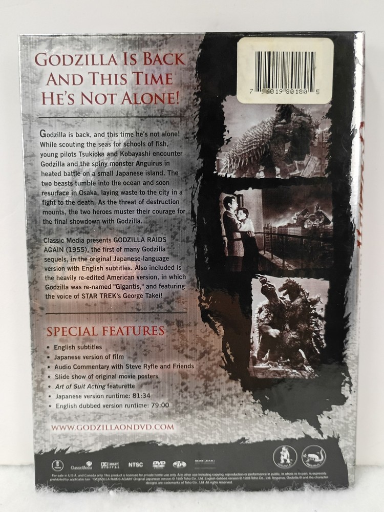 Condition --------------------------------- Great condition, little to no scratches. Description --------------------------------- Scout pilots for a fishing company are startled to discover a second Godzilla, whose battle with rival monster Anguirus threatens to destroy Osaka. Directors Motoyoshi OdaIshirô Honda Writers Takeo Murata Shigeaki Hidaka Shigeru Kayama Stars Hiroshi Koizumi Setsuko Wakayama Minoru Chiaki