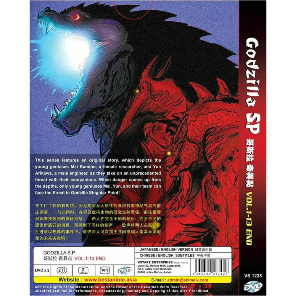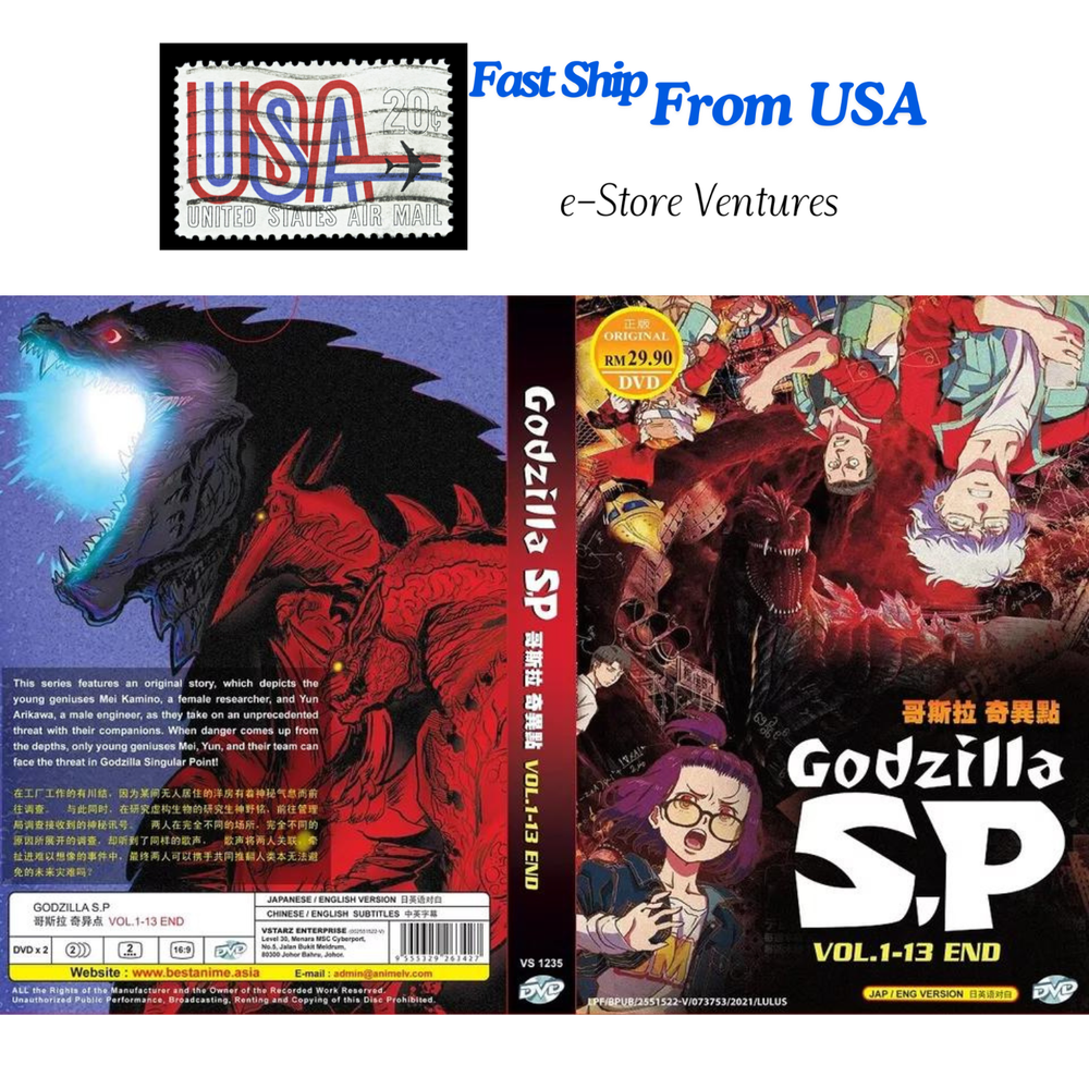 Created with Eselt - Mobile Optimized Templates for eBay Sellers Send us a message Created with Eselt - Mobile Optimized Templates for eBay Sellers Our Store Seller Profile Feedback About us Contact Created with Eselt - Mobile Optimized Templates for eBay Sellers Godzilla S.P: Singular Point DVD Numbers of episode : 1 - 13(End) Numbers of discs : 2 Language : Japanese / English Subtitles : English / Chinese Free shipping from US Synopsis : This series features an original story, which depicts the young geniuses Mei Kamino, a female researcher, and Yun Arikawa, a male engineer, as they take on an unprecedented threat with their companions. When danger comes up from the depths, only young geniuses Mei, Yun, and their team can face the threat in Godzilla Singular Point! Created with Eselt - Mobile Optimized Templates for eBay Sellers Payment Currently, we accept payment through eBay Managed Payments Shipping The products will be shipped via SingPost from Malaysia. Handling time is 1-3 working days. Your goods will be shipped with a valid tracking number. Estimate delivery is between 11 to 23 business days. Returns If you have any problem with the order, do contact us via eBay message. We are glad to assist you and solve the problem soonest. Items can be returned within 30 days in a good condition. Other Import duties, taxes, and additional charges are not included in the item price or shipping charges. Please be aware this custom import duties and taxes are buyer's responsibility. Created with Eselt - Mobile Optimized Templates for eBay Sellers Send us a message