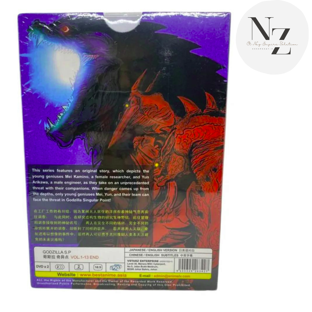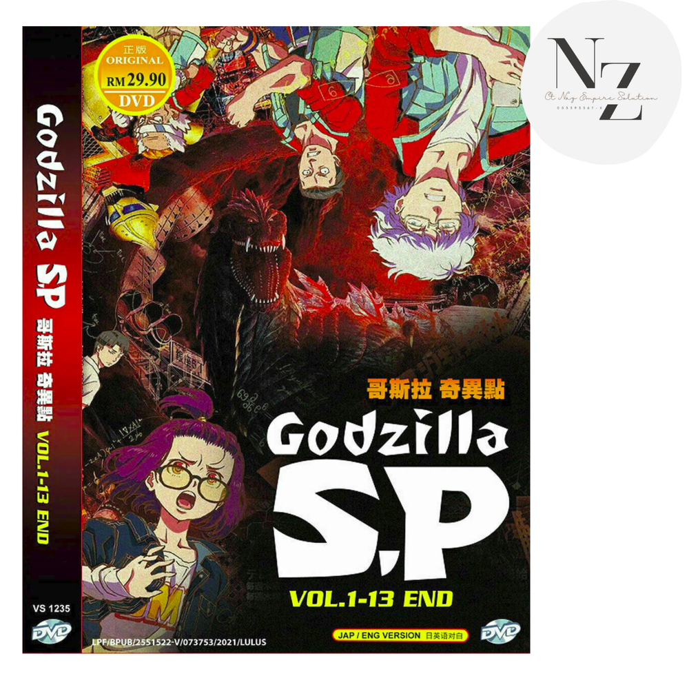 GODZILLA SP DVD Vol 1-13 End Disc Quantity : 2 Disc (1-13 Episodes) Version : Japanese/English Subtitle : English/Chinese Running Time : Approx. 325 Minutes Genres : Action, Sci-Fi, Mystery, Mecha This series features an original story, which depicts the young geniuses Mei Kamino, a female researcher, and Yun Arikawa, a male engineer, as they take on an unprecedented threat with their companions. When danger comes up from the depths, only young geniuses Mei, Yun, and their team can face the threat in Godzilla