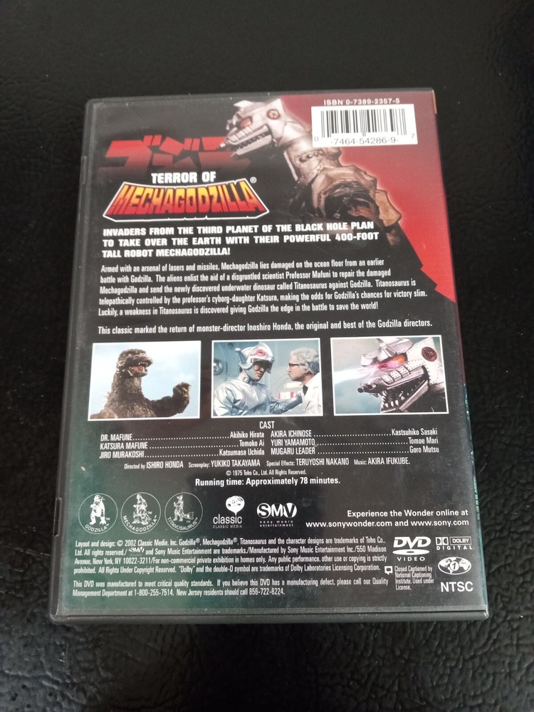 Godzilla - Terror of Mechagodzilla (DVD) ---------------------------------------------------------------------------- The case is in Very Good to Like New condition, unless of course the item is listed as NEW. Assume that any/all digital copies or codes have expired and/or are not included. The actual condition is in Very Good to Like New. We do our best to accurately describe the condition of the items that we have in our store. We do our best to make the Buyer aware of any easily observable flaws. If you have any questions about this item, please contact us before bidding or buying items. ---------------------------------------------------------------------------- ** Items Shipped USPS. Yes, we combine orders and will refund the difference in shipping.
