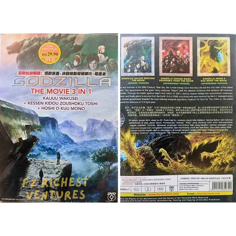 W e l c o m e T o O u r S t o r e ..! Product Description Godzilla The Movie 3 IN 1 Contents: 1) Kaijuu Wakuusei The Movie 2) Kessen Kidou Zoushoku Toshi The Movie 3) Hoshi O Kuu Mono The Movie New! English Dub for all 3 Movies Japanese language with English Subtitles is available as well. - Region Free / All Region - ~ FREE International Shipping ~ English / Chinese Subtitle Condition: Authentic, Brand NEW, Original Factory Sealed. Episode: The Movie 3 IN 1 No. of Discs: DVD x 1pc * Region Code: All Region/Region FREE "0" ( Able to play on any DVD Players throughout the World) Audio Language: English / Japanese Subtitles: English / Chinese T h a n k y o u !!! **We Are Waiting To Give Our Best Service To Our Customers And Make Them Happy (^_^)** PAYMENT -Currently, we accept payment through eBay-managed payment. SHIPPING -The products will be shipped via SingPost from Malaysia. Handling time is 1-3 working days. Your goods will be shipped with a valid tracking number. All products are packed, and layered with bubble wrap to reduce damages during shipment delivery. Estimate delivery is between 11 to 23 business days. RETURNS -If you have any problem with the order, do contact us via eBay message. We are glad to assist you and solve the problem as soon as possible. Item can be returned within 30 days in a good condition. OTHER -Note : Import duties, taxes and additional charge are not included in the item price or shipping charge. Please be aware this custom import duties and taxes are buyer’s responsibility.