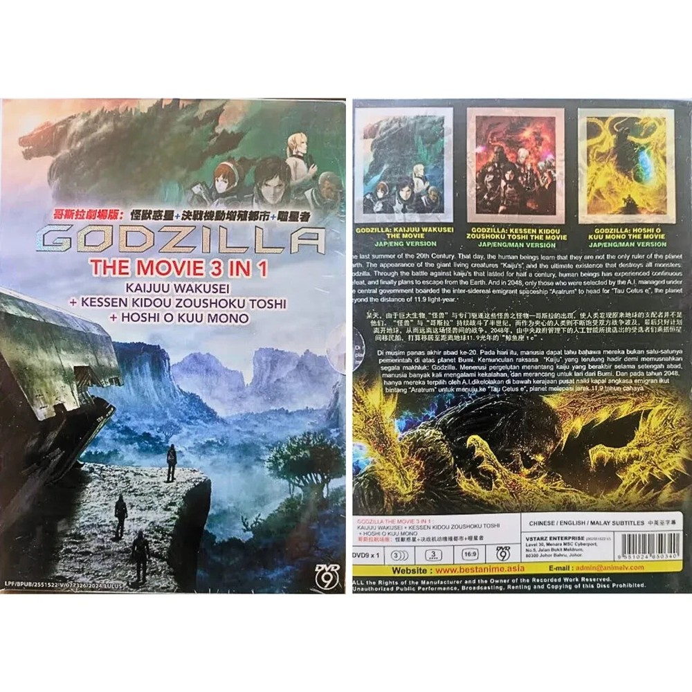 Title : Godzilla The Movie 3in1 Kaijuu Wakusei+Kessen Kidou+Hoshi O Kuu Mono DVD Eng Dub Product Description: Weight : 163g SKU : SKCT-17012503 Number of Disc. : 1 DVD Episodes : 3 Movies Audio (Dialogue): English / Japanese Subtitled : English / Chinese / Malay DVD Region Code : Region Free, All (NTSC) Godzilla 1 : Kaijuu Wakusei (Planet of the Monsters): Twenty thousand years after the fall of humanity, Earth succumbed to legions of ravenous creatures who now freely roam the planet. Far away in the depths of space, the last surviving members of humanity float aimlessly in the same ship they escaped Earth with so many years ago. With the spacecraft running dangerously low on resources, the survivors' leading council must decide on their path forward: should they continue to gamble on finding another Earth-like planet to inhabit, or take to heart an anonymous essay theorizing what may be the only weakness of the "Godzilla," who forced the last remnants of humanity off their home world? The author of the controversial essay is Haruo Sakaki, a man who witnessed the death of his parents to Godzilla at a young age, which has led him to harbor an obsessive hatred for the monster. Now, he spearheads the operation aimed at reclaiming humanity's birthright from the king of monsters and slaying him once and for all. But, alongside humanity, Earth has undergone drastic change since their departure; Godzilla and its numerous spawns may pale in comparison to the darkness lurking within the hearts of this close-knit community of survivors. Godzilla 2 : Kessen Kidou Zoushoku Toshi (City on the Edge of Battle): After a desperate battle and many losses, humans finally slay Godzilla—the monster that caused humanity to flee Earth 20 thousand years prior. But the creature Haruo Sakaki's troops killed was not alone; there existed another Godzilla on Earth yet to be defeated. Grievously wounded from the first conflict, Sakaki wakes up in the home of a young girl who is a member of the Houtua tribe. Bearing a shocking resemblance to humans, the Houtua have adapted to survive the changed climate of the planet that had long been abandoned. With most of their resources depleted, the remaining members of Sasaki's special forces struggle with the decision to abandon their mission and their home planet or to fight an improbable battle. Hope is not completely lost however, as the members from the Bilusaludo race of aliens discover remnants of their anti-Godzilla weapon Mechagodzilla. Even with this powerful weapon in their arsenal, victory seems impossible to grasp: Godzilla has spent all this time evolving and preparing to defeat anyone who dares to challenge its superiority. Godzilla 3 : Hoshi wo Kuu Mono (The Planet Eater): With the defeat of the Bilusaludo's nanometal city, the destruction of humanity seems inevitable. Worse yet, Captain Haruo Sakaki's refusal to sacrifice his humanity has come under fire from the remaining Bilusaludo troops, who blame him for their defeat. In their darkest moment, the few surviving humans turn to the religion of the Exifs, which promises that devotion is the path to salvation from Godzilla. However, the Exif are not what they seem. As the survivors become more and more zealous in their devotion, Sasaki wonders what exactly the priest Metphies is hiding—especially regarding his relationship with the monster known as Ghidorah. PAYMENT POLICY: Currently, we accept payment through eBay-managed payment. SHIPPING POLICY: We ship using Economy Shipping from Malaysia which takes 11 to 23 business days to reached customers. If you wish (borned by buyer), we also can provide Express shipping from Malaysia with estimated time arrival up to 5 business days. RETURN: Our policy allign with ebays professional law standards. Buyers covered by the ebay Money Back Guarantee are eligible for refunds in this situations: damaged item, item not matching the description or wrongitem. To initiate a refund, provide evidence of shipping damage and save the packaging. If you no longer want the item, we accept returns as long as it's in the same condition as when shipped. Refunds will be issued minus the original shipping cost. Return the item within the specified period, umopened with no missing parts or damage to the packaging. Once the item is delivered and in satisfactory condition, a refund will be issued within 2 days. Unreasonable circumstance or failure to meet conditions may result in a non-accepted return. FEEDBACK: We highly value and appreciate your feedback. Your experience is important to us, and if there are any areas where we can improve, please let us know before leaving any feedback. Our customer are our top priority, and we take your feedback seriously. We are committed to working together to find resolution that satisfy you. Please contact us through ebay messaging, including your contact information and order number. Thank you for shopping with us. APPRECIATION: I thank you for your visit to our store, and appreciate you buying. Please do visit us again!