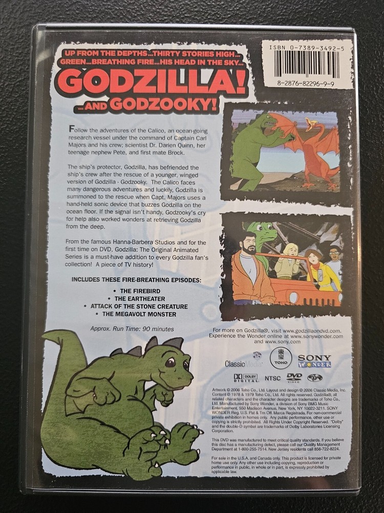 This is an authentic copy of Godzilla: The Original Animated Series - Vol. 1 on DVD. To clarify the conflicting dates of it's release above in the description, it originally ran from 1978-1979 with 2 seasons. It eventually was released in 2006-2007 on DVD, which these are those versions. It comes complete in box with the DVD case and the disc. Also, the DVD case is not missing any insert, it just comes plain with only the disc. Both the disc and the DVD case are in very good condition. There are no dents, rips, tears, or major damage to the DVD case. There is minor micro, cosmetic scratches on the plastic film that only become visible if you use a light on it and angle it. Otherwise, they aren't visible. The disc is in very good condition with only a couple of micro scratches visible under bright light. These scratches are not from poor care, but from use in a DVD player that has given them cosmetic scratches after many uses. The disc has been tested to be in perfect working condition. Handling time will be handled quickly and shipping will occur promptly within 2 business days after payment.