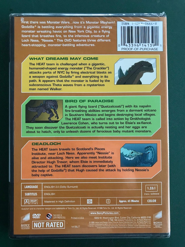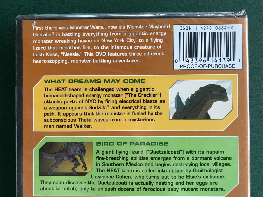 Godzilla: The Series -- Monster Mayhem (DVD) NEW , unopened, still SEALED in its original factory shrinkwrap. MINT CONDITION. Item in photos is actual item that will be shipped. Not a bootleg or former rental. Please message us with any questions, we're happy to help! Picking up where the blockbuster motion picture left off , GODZILLA: THE SERIES is a fast-paced animated adventure series that pits humanity against a new generation of giant monsters. GODZILLA: THE SERIES MONSTER MAYHEM includes the episodes: What Dreams May Come, Bird of Paradise, and DeadLoch. Shipping Information FREE SHIPPING! We will mail all orders within 2 business days of payment, via USPS Media Mail, unless otherwise arranged. Your tracking number will be provided, and we will message you when it is mailed. For faster shipping, please pay extra, depending on which service. Please contact us. For international sales, please use eBay's Global Shipping Program. Returns Customer satisfaction is guaranteed! If you are unhappy with your order, please contact us. We will pay for the return shipping, and when we receive the return, we will issue you a full refund. We try our very best to make sure every customer is completely satisfied. If there's a problem, message us! Your satisfaction is our priority! Additional Info Please note that 99.9% of our DVD and Blu-ray listings are Region 1/A for playback in North American players. Visit our store! We have many other items also priced to sell! Thank you for your business!