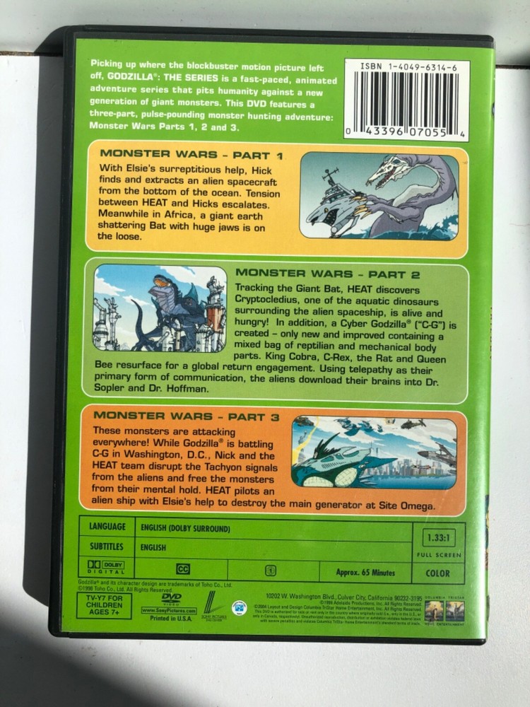 Godzilla The Series The Monster War Trilogy 1999 DVD. Tested and works Like new. See pictures for details on condition, many are provided to ensure my buyers know exactly what they will be receiving.I ship with the utmost care to maintain condition of your purchase, I ship using Canada Post and feel free to ask about combined shipping and shipping options. Be sure to check out my other listings for more Godzilla DVD’s and more .