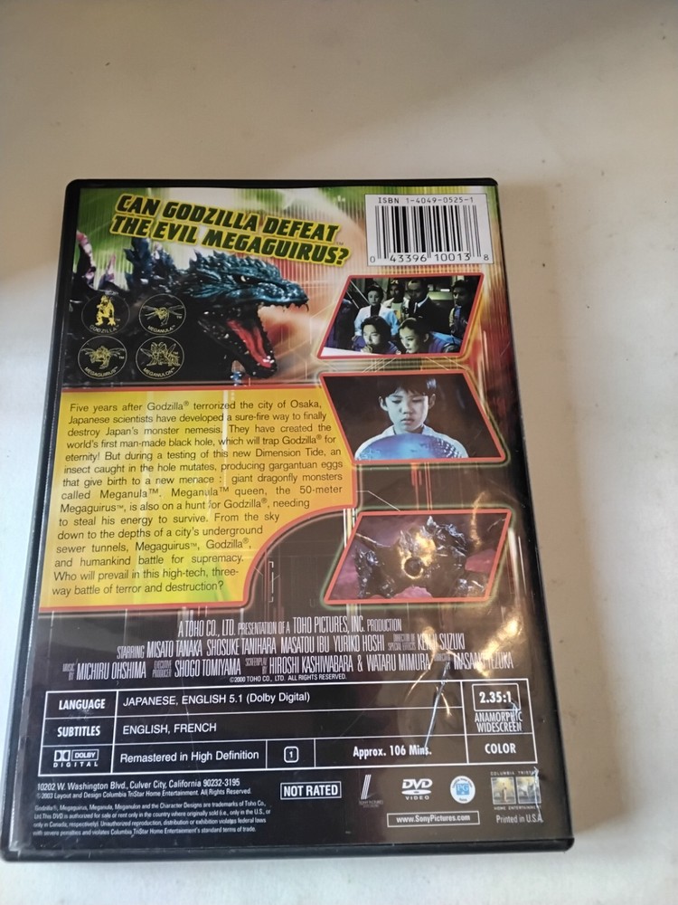 This DVD features the epic battle between Godzilla and Megaguirus, two iconic creatures from the Japanese sci-fi and fantasy genre. The film is presented in English language and is rated NR. It is a standard edition DVD format, perfect for collectors and fans alike. The studio behind this production is Sony Pictures, known for their high-quality cinematic releases. This DVD falls under the category of Movies & TV and DVDs & Blu-ray Discs, making it a must-have for any collector's edition.