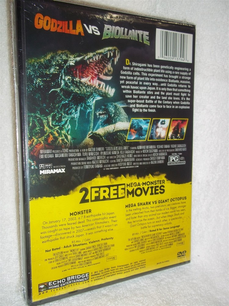 PLEASE READ BELOW BEFORE BIDDING AND ASKING ANY QUESTIONS ITEM DESCRIPTION This DVD is previously viewed but in EXCELLENT condition. The disc(s) is LIKE NEW. It includes all the original cases, covers, inserts and, of course, the disc(s) itself. Product Description Dr. Shiragami has been genetically engineering a form of indestructible plant life using a rare supply of Godzilla cells. This experiment has brought a strange new form of plant life into existence: Biollante, massive, yet peaceful in every way...until Godzilla returns to wreak havoc upon Japan. It is only then that something within Biollante stirs and the plant must fight to save her creator and the land she loves. It's the super-beast Battle of the Century when Godzilla and Biollante come face to face in an explosive fight to the finish. Special Feature(s): Making of GODZILLA VS BIOLLANTE; Behind the Design; 5.1 DTS Original Japanese Language; 2.0 DTS Japanese Language; 1.0 Dolby Digital English Language; English translation of on screen text; English subtitles translated from original Japanese dialogue; English SDH subtitled to match the English audio track PLUS BONUS MOVIES MONSTER AND SHARK VS OCTOPUS OUR TERMS AND GUARANTEES We will contact the auction winner(s) via email within 24 hours of auction close with any specific instructions that may be necessary to complete the transaction. We will also notify the auction winner(s) when their order has been shipped by sending an email to their ebay email address. WE DO NOT SELL illegal bootleg tapes, copies, screeners, or any type of illegally burned CDs/DVDs! ALL ITEMS ARE FACTORY ORIGINALS and, unless otherwise noted, include their ORIGINAL US factory made cases, inserts/game book and, of course, the items themselves. All DVDs are GUARANTEED. If you receive a damaged, defective or otherwise unusable item from us, please inform us within 15 days of shipment and we will replace the defective product. In the event that the defective item is no longer available, we will substitute for another item, credit your account or issue a refund minus the Shipping. Buyer must make contact within 3 days of the end of auction and payment must be made within 10 days of the end of auction. Please have funds ready to send when you are bidding. Your personal information will never be shared or sold to anyone. Your transaction is strictly confidential, and you will receive your product in discreet packaging . Finally, there should NEVER be a reason to leave us negative feedback. That is NOT the proper way to get our help with a problem, just contact us and give us a chance to provide an appropriate solution. Permanently hurting our reputation by leaving us negative feedback or threatening negative feedback will NOT get you the service you are looking for, again, just email us if you have a problem with your purchase. PAYMENT TERMS Payment is expected within 10 days after the auction closes. Please include the following with your payment: Username Auction number(s) Item name Shipping Address We accept the following forms of payment: . PAYPAL Credit Cards (Contact us for details) SHIPPING TERMS Your DVD(s) will be shipped within 48 hours of receipt of payment. All DVDs will be shipped discreetly . The flat rate shipping fee using USPS FIRST CLASS MAIL is $ 3.00 for the 1st DVD, $2.00 for each additional within the USA . International orders, INCLUDING CANADA, using USPS AIRMAIL are $20.00 for the first DVD, $5 for each additional. Rush and Expedited shipping options are available to most areas; please feel free to contact us for pricing and other details regarding the auction. I COMBINE SHIPPING Please View Our Other Auctions And Save On Shipping Powered by SixBit's eCommerce Solution