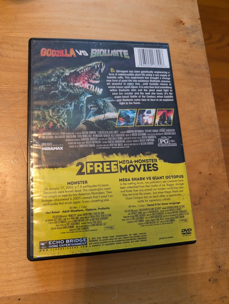 The product is a DVD of the movie "Godzilla Vs Biollante." This DVD likely features the epic battle between Godzilla and Biollante, a genetically-engineered creature created from Godzilla's cells. Fans of the Godzilla franchise will enjoy this classic film that showcases thrilling monster battles and exciting special effects. The DVD format allows viewers to watch the movie in the comfort of their own home, experiencing all the action and excitement of this iconic Kaiju film.