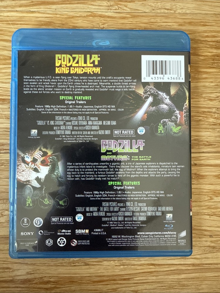 The product is a rare out-of-print Blu-ray set titled "Godzilla Vs. King Ghidorah / Godzilla and Mothra: the Battle for Earth", released in 1992. Directed by Takao Okawara and Kazuki Omori, this sci-fi contemporary movie has a run time of 203 minutes and is rated NR. Produced by Sony Pictures, this set features the iconic monsters Godzilla, King Ghidorah, and Mothra in a thrilling battle for Earth. A must-have for fans of the legendary Godzilla franchise, this Blu-ray set offers a high-quality viewing experience of these classic films.